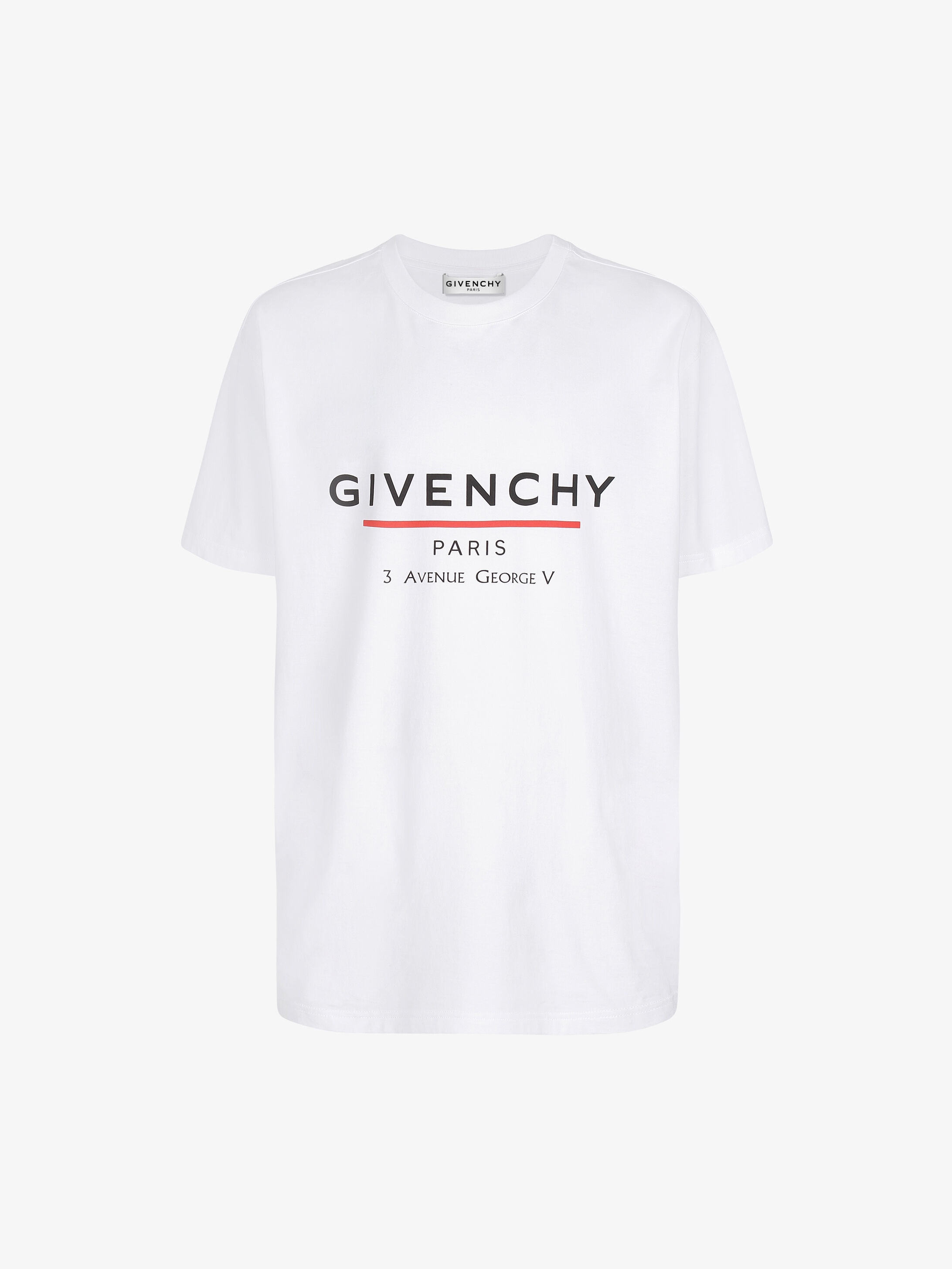 White jersey T-shirt with black and red GIVENCHY Label print on the chest. Product code: BM70U23002-100 Composition: 100% cotton. Size & Fit This piece has been designed as an oversized fit. Model wears a size M. Model size: chest 82cm, waist 75cm, hips 89cm, height 189cm. Other Country of origin: Portugal.
