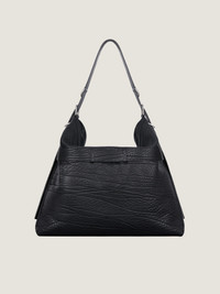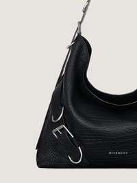 - Large crossbody bag in grained calfskin leather. - Voyou line. - V-shaped slouchy silhouette. - Adjustable shoulder strap offering crossbody or shoulder carrying. - GIVENCHY signature embossed on the front of the bag and on the top of the shoulder strap. - Oversized GIVENCHY engraved metal sliding buckles to adjust the volume of the bag. - Old silvery-finish metal details. - One main compartment. - One inside zipped pocket. - Cotton lining.