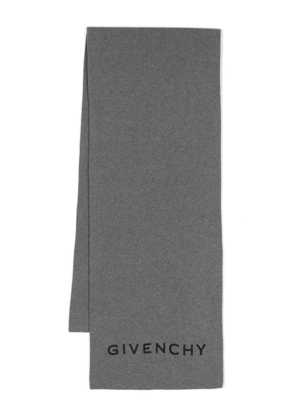 logo-embroidered knitted scarf Highlights - Dark grey - Wool-cashmere blend - Logo print to the front - Wraparound style - Finished edge Made in Italy Composition Wool 70%, Cashmere 30% SIZE & FIT Measurement LENGTH 78.74 in(200 cm) WIDTH 18.5 in(47 cm) Washing instructions Dry Clean Only