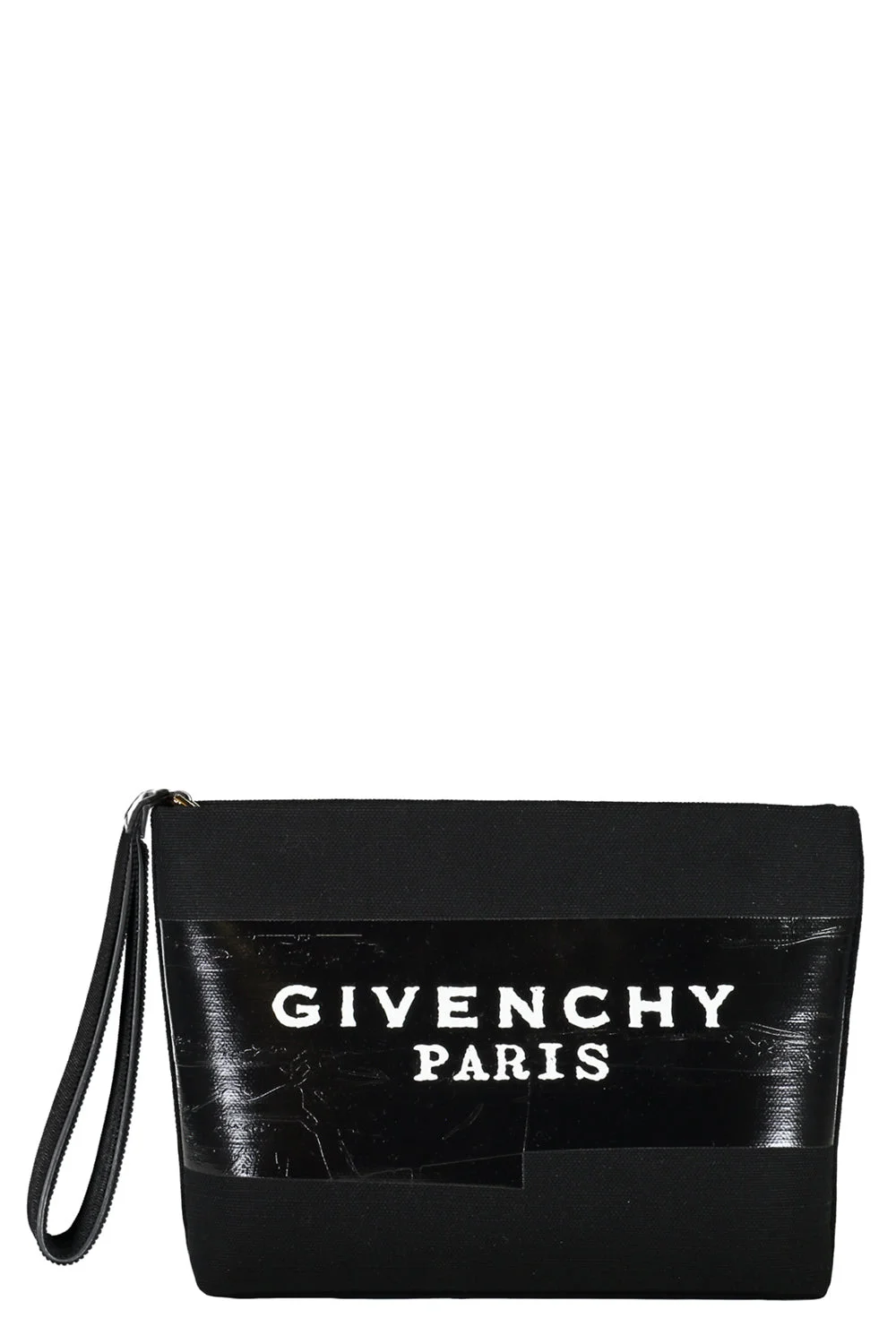 DETAILS AND INSIGHT Givenchy logo pouch clutch in black. 58% Cotton, 38% Linen/Flax, 4% Polyurethane Depth: 2.16", Height: 7.87", Width: 9.05" Fits Iphone 16 Pro Max Made In Italy Style BB60PNB2CL001
