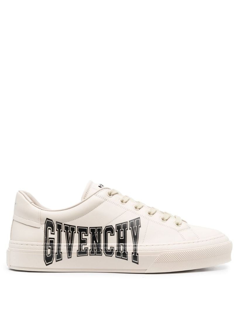 Description logo-print leather sneakers Highlights ['* light beige', '* calf leather', '* logo print to the side', '* logo plaque at the tongue', '* logo stamp to the rear', '* round toe', '* front lace-up fastening', '* branded leather insole and flat rubber sole.'] Made in Italy Composition OUTER: Furs & Skins->Calf Leather 100% SOLE: Rubber 100% LINING: Furs & Skins->Calf Leather 100% Model Measurement Sole height 2.5(cm)