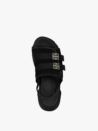 - Sandals in suede and smooth calfskin leather. - Color: black. - Wide strap with hook-and-loop fastened closure featuring two 4G metal buckle straps on the front. - Canvas strap with GIVENCHY leather reinforcement on the back. - Light and comfortable thick sole. - GIVENCHY signature in relief on the back. - 4G emblem engraved on the side.