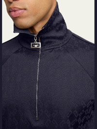 Givenchy jersey track shirt with allover 2G pattern Zip-up neckline Silvertone 2G zipper pull Long raglan sleeves Banded cuffs and hem Pullover style Polyester/cotton Made in Italy Model is 6'1"/185cm. Online Inquiries: BGS21_NCDUC| Store Inquiries: #4863242