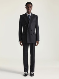 - Structured jacket in wool with stripes. - Pointed collar. - Gros grain detail on the neckline. - Double breasted. - Buttoned cuffs. - One chest pocket. - Two front flap pockets. - Fitted cut. - Model measures 6.1 Feet and wears a size 48.