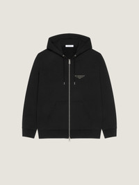 - Long-sleeved hooded sweatshirt in fleece. - GIVENCHY Stamp printed on the chest. - Drawstring on the hood. - Zipped closure. - One kangaroo pocket on the front. - Model measures 6.1 Feet and wears a size M.