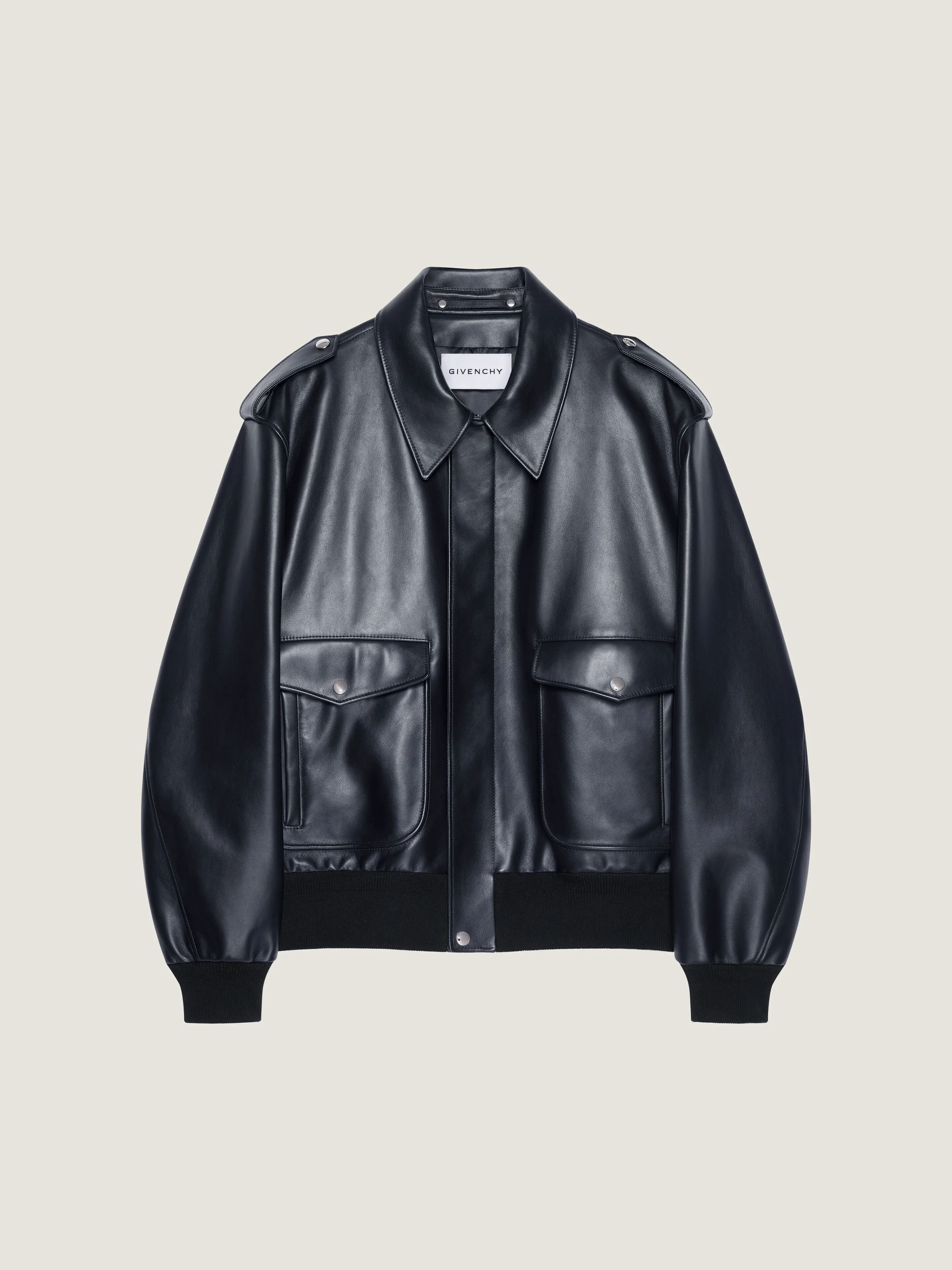 - Aviator jacket in calfskin leather. - Classic collar. - GIVENCHY signature debossed on the leather zip puller. - Zipped closure. - Two front flap pockets. - Ribbed elasticated knit hem and cuffs. - Bias seams for a cocooning volume. - Relaxed fit. - Model measures 6.1 Feet and wears a size 48.