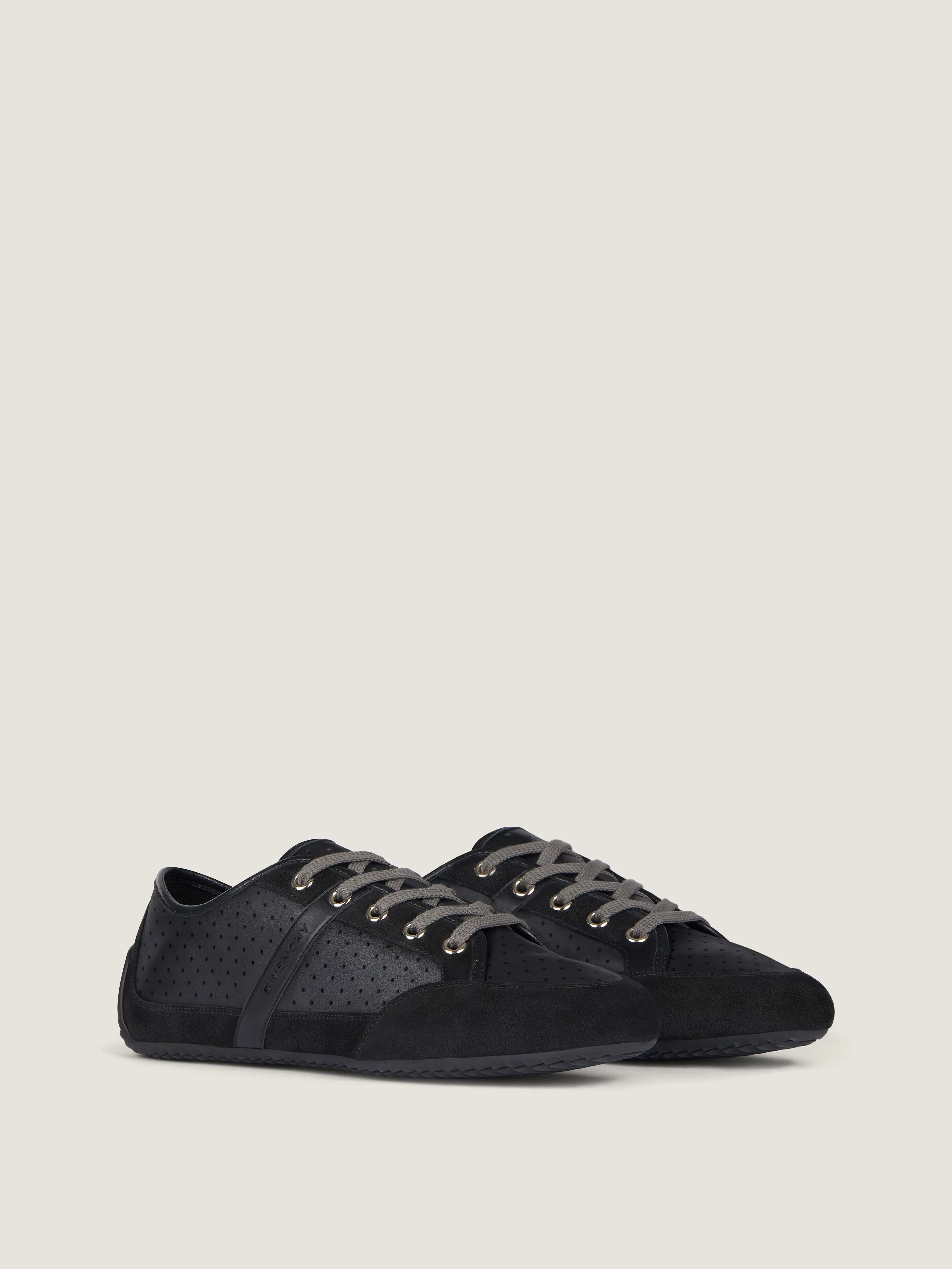 - Low sneakers in perforated leather and suede leather. - Slim line. - Raised GIVENCHY signature on the side. - GIVENCHY Paris signature printed on the leather insole. - Slim and flat silhouette with almond toe shape. - Thin rubber sole allowing great flexibility and comfort.