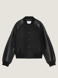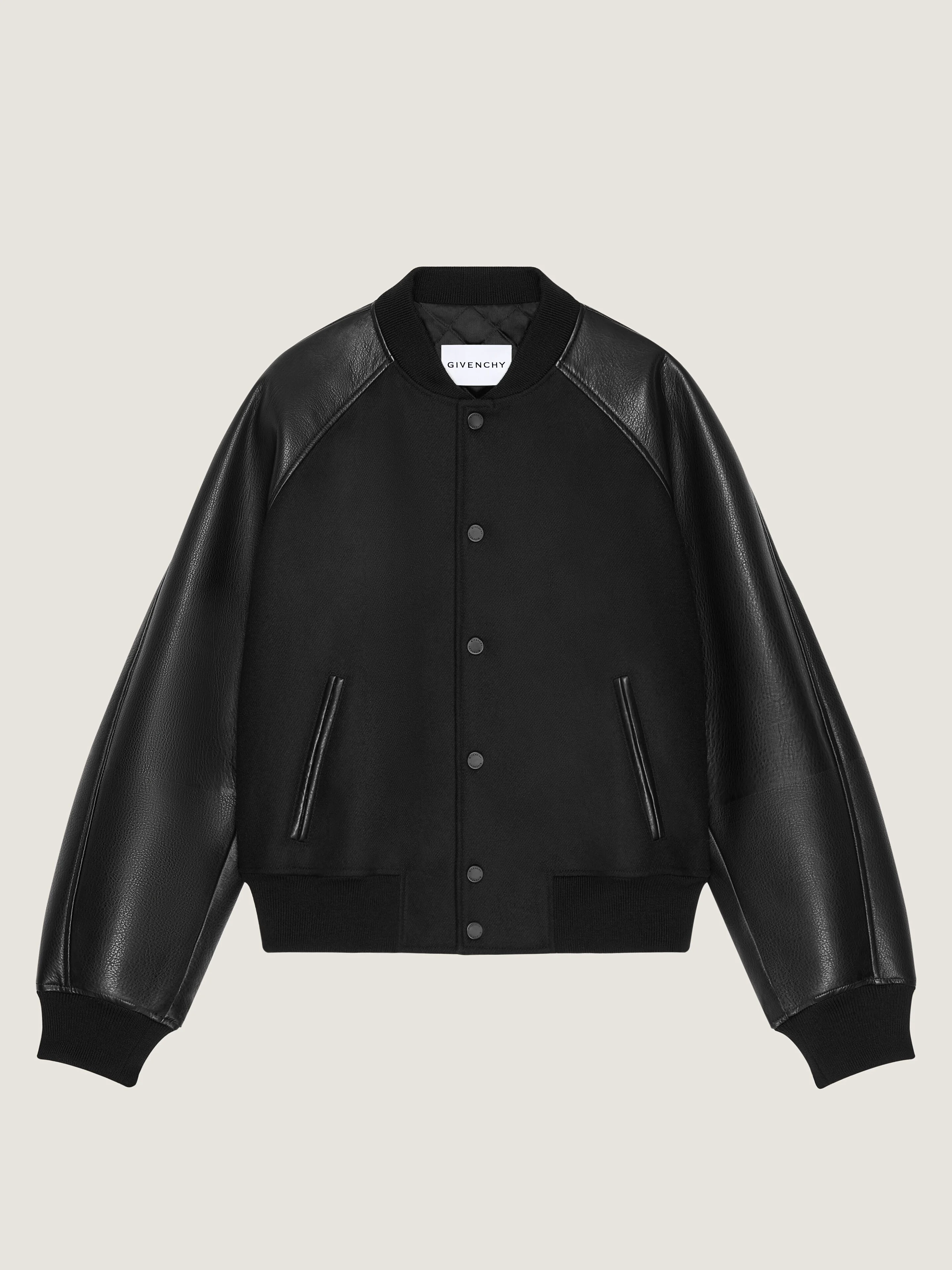 - Bomber in wool with nappa leather sleeves. - Bomber collar. - GIVENCHY Paris signature in leather embroidered on the back. - Snap button closure. - Two side pockets with leather piping. - Elasticated knitted collar, hem and cuffs. - Couture seams for a rounded proportion. - Model measures 6.1 Feet and wears a size 48.