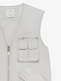 - Sleeveless jacket in technical nylon. - Metal zipper closure with GIVENCHY 4G zipper pull. - GIVENCHY signature embroidered on the chest. - Three flap pockets and one zippered pocket on the chest. - Two raised zippered pockets on the sides. - Four small flap pockets on the shoulders. - Two zippered pockets on the back.
