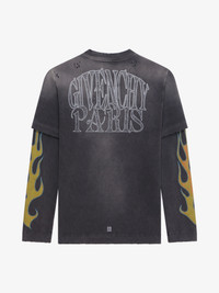 - Long sleeved t-shirt in washed cotton jersey. - Overlayed effect. - Crew neck. - Short-sleeved used effect t-shirt with GIVENCHY Address print on the front, GIVENCHY Paris on the back and small 4G emblem on the lower back. - Long sleeves with GIVENCHY Flames print. - Classic fit.