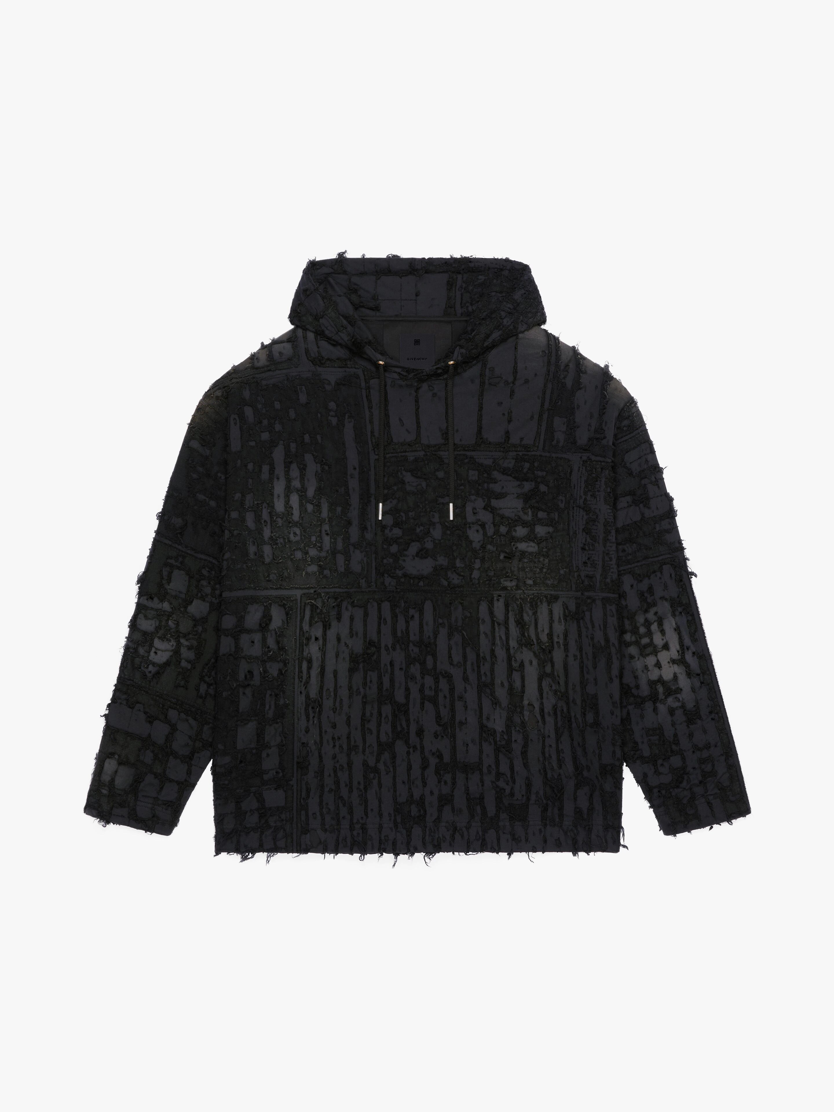- Hooded sweatshirt in ripped-effect boro-style felpa and jersey. - Color: faded black. - Topstitching and rips with worn effect. - Arranged in a patchwork. - Comfortable oversized fit.