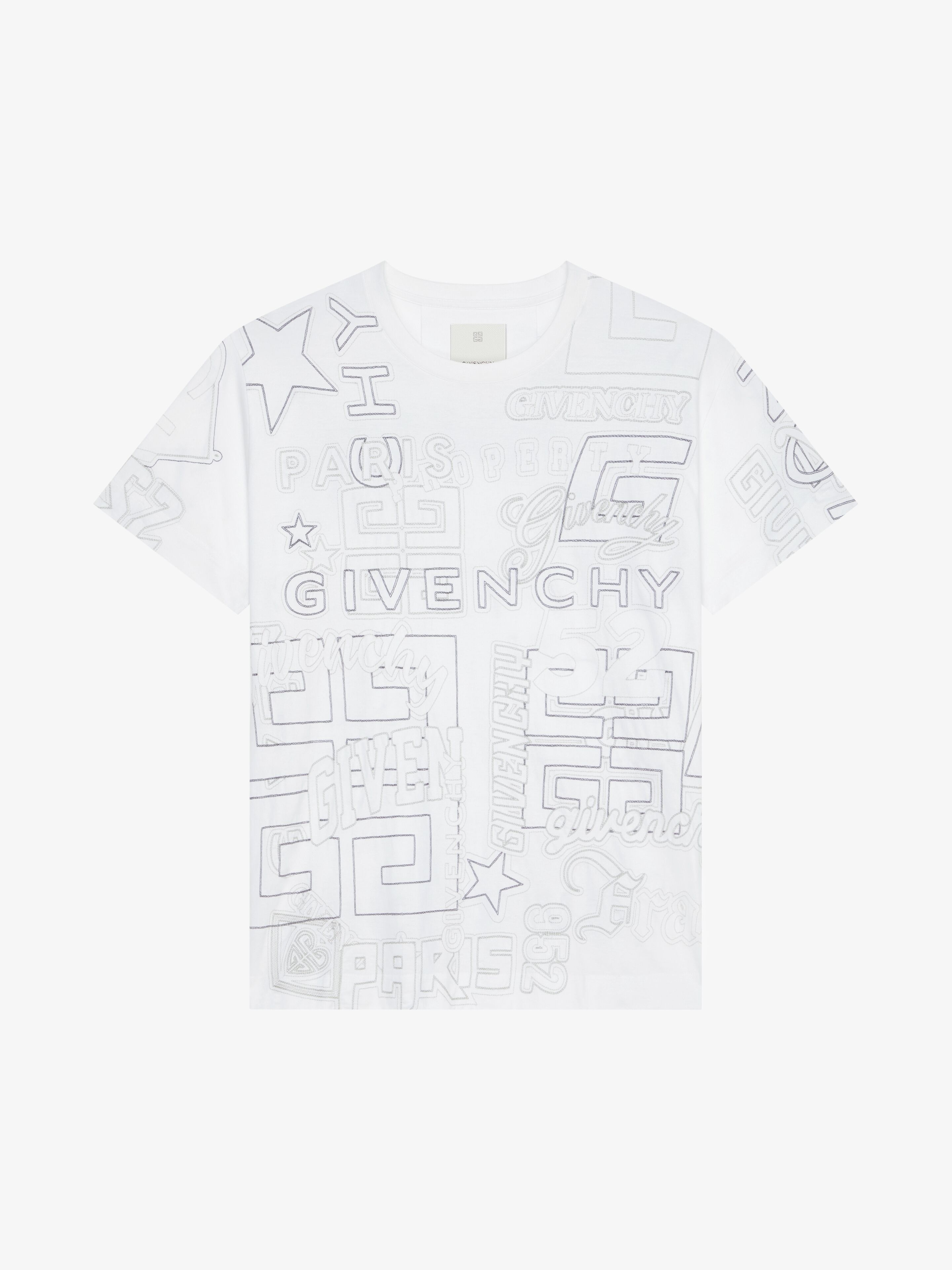 - Short-sleeved t-shirt in cotton. - Crew neck. - GIVENCHY embroideries artwork all-over. - Oversize fit.