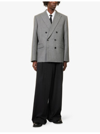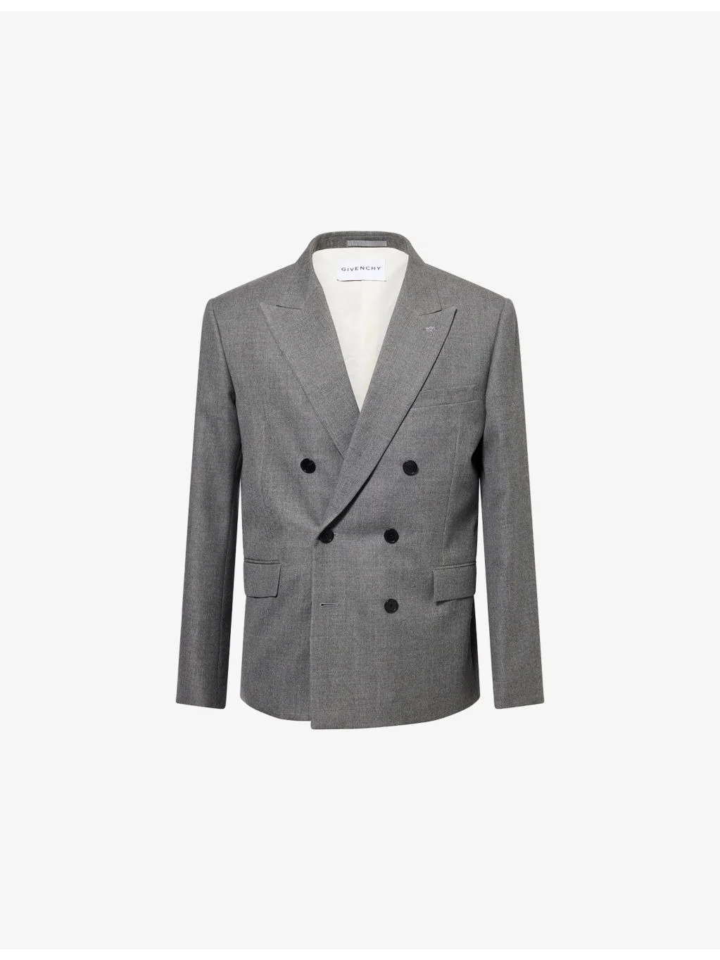 PRODUCT DETAILS - Givenchy wool blazer - 100% wool; lining 100% cotton; sleevelining 100% viscose - Exposed button fastening at front - Regular fit, double-breasted, peak lapels, padded shoulders, long sleeves, buttoned cuffs, welt pocket and two flap pockets at front, fully lined, double vent - Dry clean - Made in Italy - Size UK 40: length 29in / 75cm, chest 40in / 102cm - Model is 6ft 2in/1.88m and wears a size UK 40 - Midweight, slight stretch Ref: R04480881