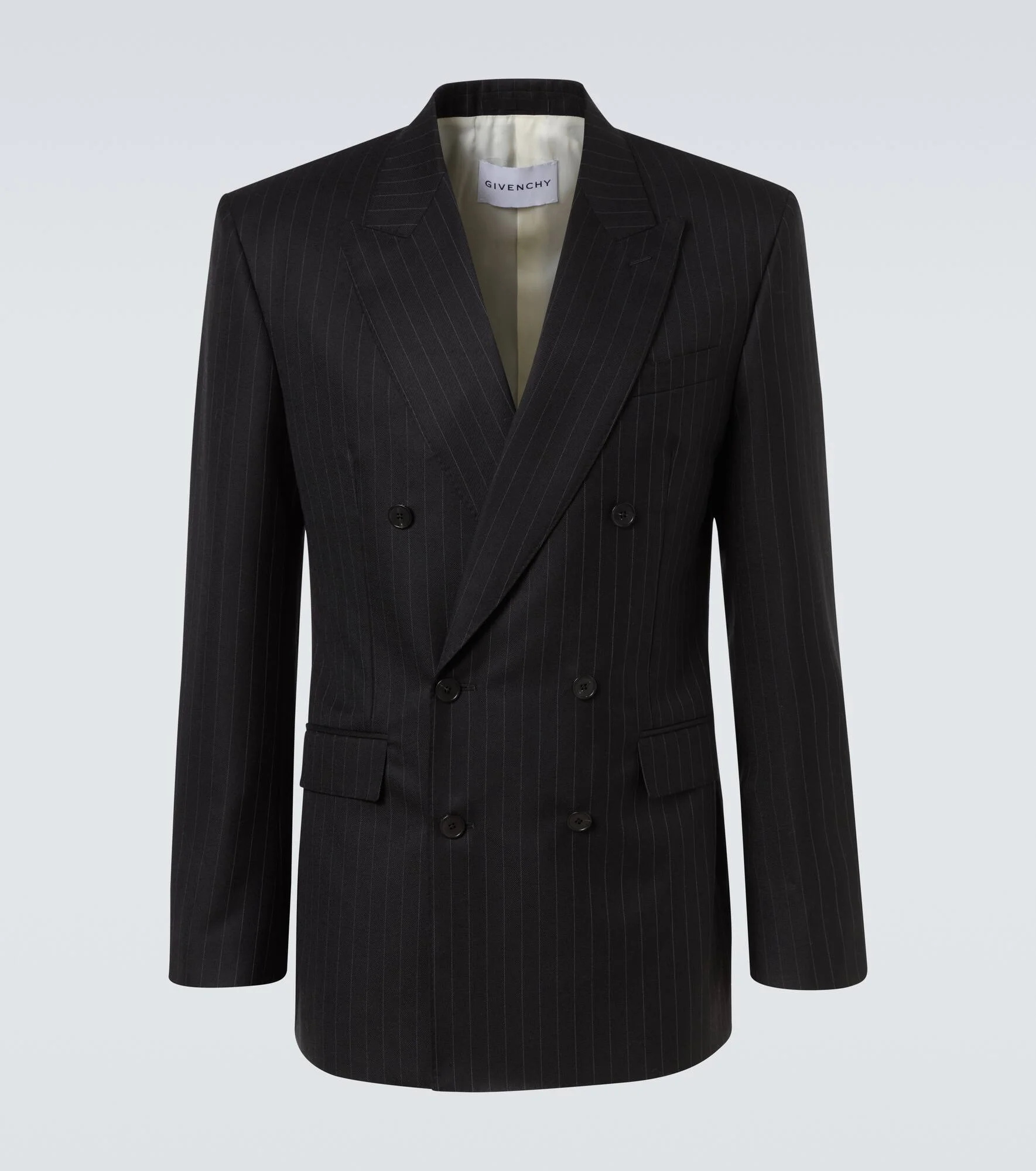 Givenchy's precise and timeless tailoring echoes the elegant silhouettes of the brand’s early years. Made in Italy from pure wool, this pinstripe blazer has a double-breasted silhouette and is finished with both flap and slant pockets. Product Details - Material: 100% wool - Care instructions: dry clean - Made in Italy - Designer color name: Black/Grey - Item color: black - Lining: 100% cupro - Sleeve lining: 100% viscose - Closure: double-breasted (six buttons) - Collar: notch neck - Pockets: flap pockets, slant pocket - Vent: double - Item number: P01069946 Size & Fit - True to size - Shoulder pad inserts - Regular fit - Non-stretchy fabric - Falls below the hip - The model in the picture is 185cm-6'1" and wearing a size IT 50