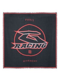 racing-print square scarf Highlights - Black/red - Modal blend - All-over graphic print - Logo print to the front - Fringed edge Made in Italy Composition Modal 90%, Cashmere 10% SIZE & FIT Measurement LENGTH 47.24 in(120 cm) WIDTH 44.88 in(114 cm)