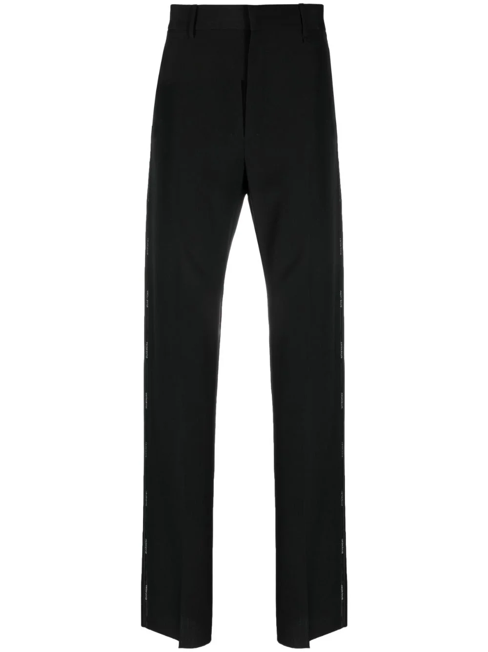 logo-tape tailored trousers Highlights - Black - Wool - Logo-tape detailing - Tailored cut - Straight leg - Mid-rise - Concealed front fastening - Belt loops - Two side slit pockets - Two rear welt pockets - Pressed crease Made in Italy Composition Outer: Wool 100% Lining: Acetate 60%, Cupro 40% SIZE & FIT Model measurements Height 6 ft 2 in(1.87 m) Bust/Chest 36.41 in(92.5 cm) Hips 37 in(94 cm) Waist 29.52 in(75 cm) FittingInformation Designed for a straight-leg, allowing for an unrestricted and comfortable fit over the leg The unfinished hems allow for the length to be altered Made from a midweight non-stretch fabric This piece fits true to size – take your usual size Measurement FRONT RISE 13.58 in(34.5 cm) INSIDE LEG 33.85 in(86 cm) HIPS 43.3 in(110 cm)