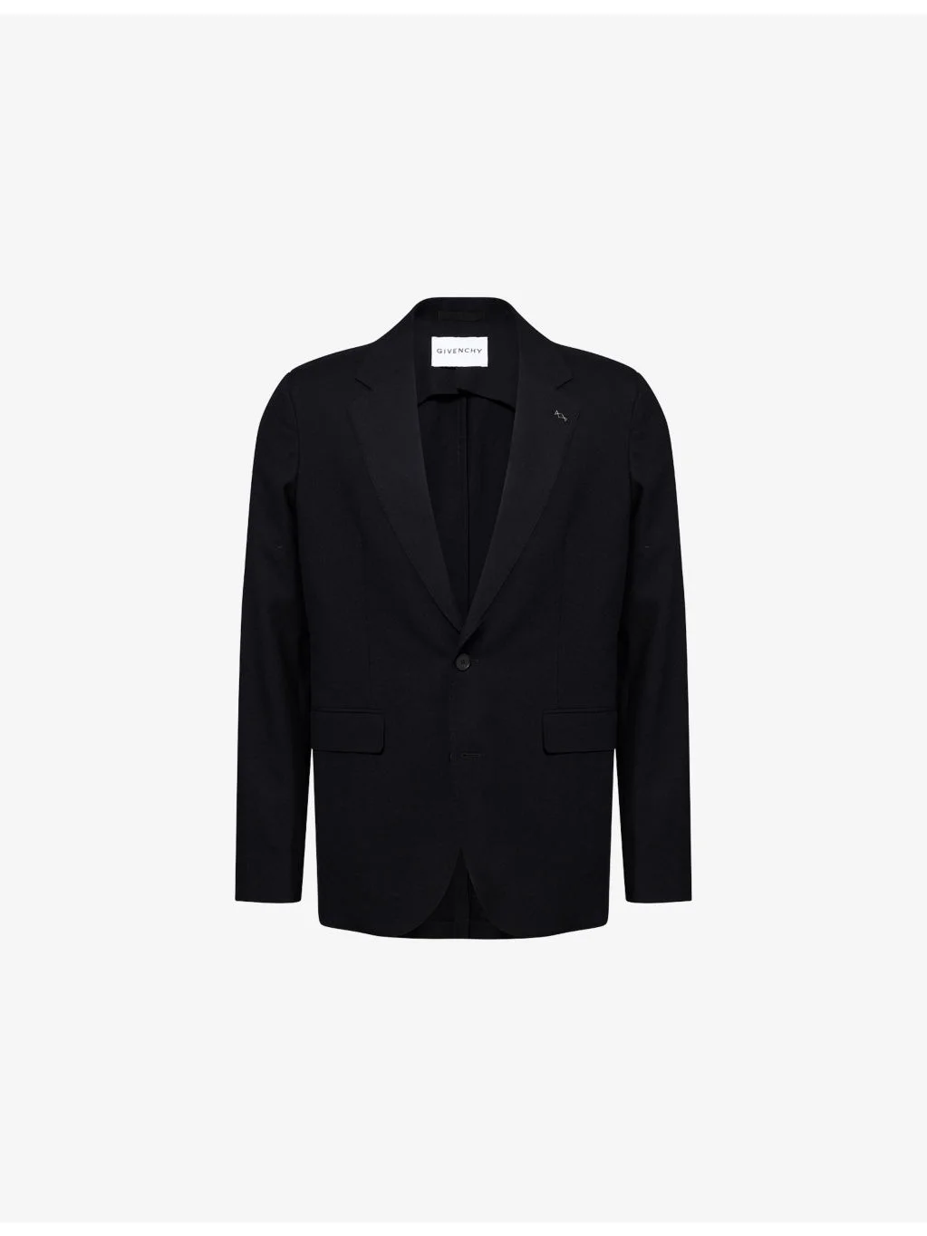PRODUCT DETAILS - Givenchy wool blazer - 100% wool; sleevelining 100% cupro - Exposed button fastening at front - Regular fit, single-breasted, notch lapels, long sleeves, buttoned cuffs, welt pocket and two flap pockets at front, partially lined, single vent - Dry clean - Made in Italy - Size UK 40: length 30in / 77cm, chest 40in / 102cm - Model is 6ft 2in/1.88m and wears a size UK 40 - Midweight, slight stretch Ref: R04480850