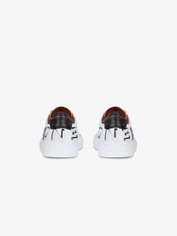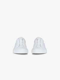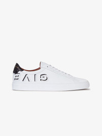 DETAILS Urban Street sneakers in matte white leather with inverted GIVENCHY signature in black and white split letters and gold debossed GIVENCHY PARIS signature on the tongue. Black leather inset, knots, and gold GIVENCHY PARIS signature on the back. Natural leather insole. Composition: 100% calfskin leather. Secondary materials: 100% calfskin leather. - Country of origin: Portugal. - Product code: - BH001DH0E2-116