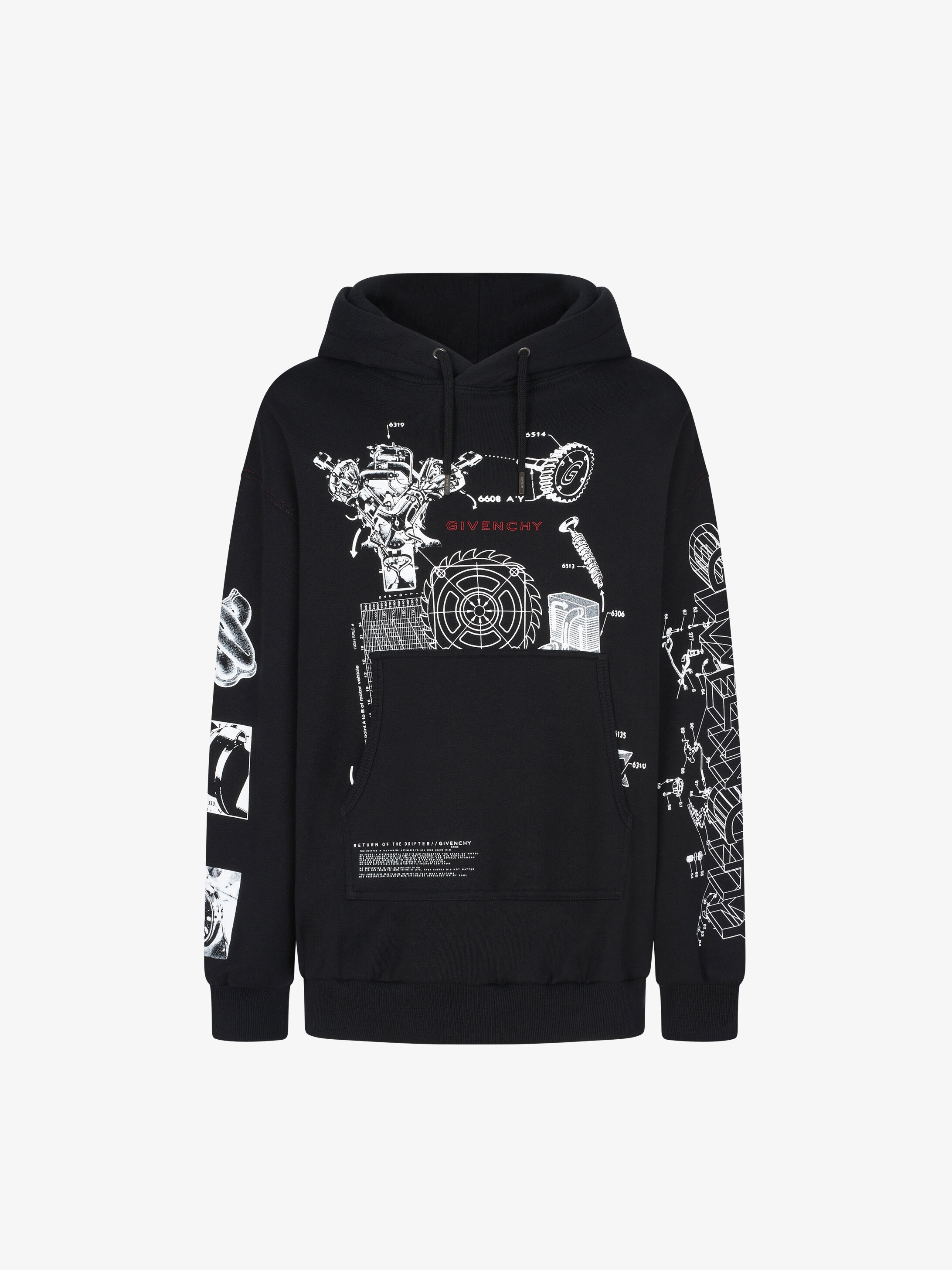 Hooded black felpa sweatshirt with red GIVENCHY signature on the chest, white Schematics prints on the front and sleeves, and contrasting red topstitching. One large pocket on the front. Product code: BMJ09L305B-001 Composition: 100% cotton. Other Country of origin: Portugal. Maximum wash 30°C, delicate cycle Iron at maximum soleplate temperature (110°C) without steam Do not tumble dry Do not bleach Do not dry clean