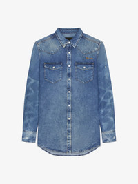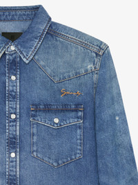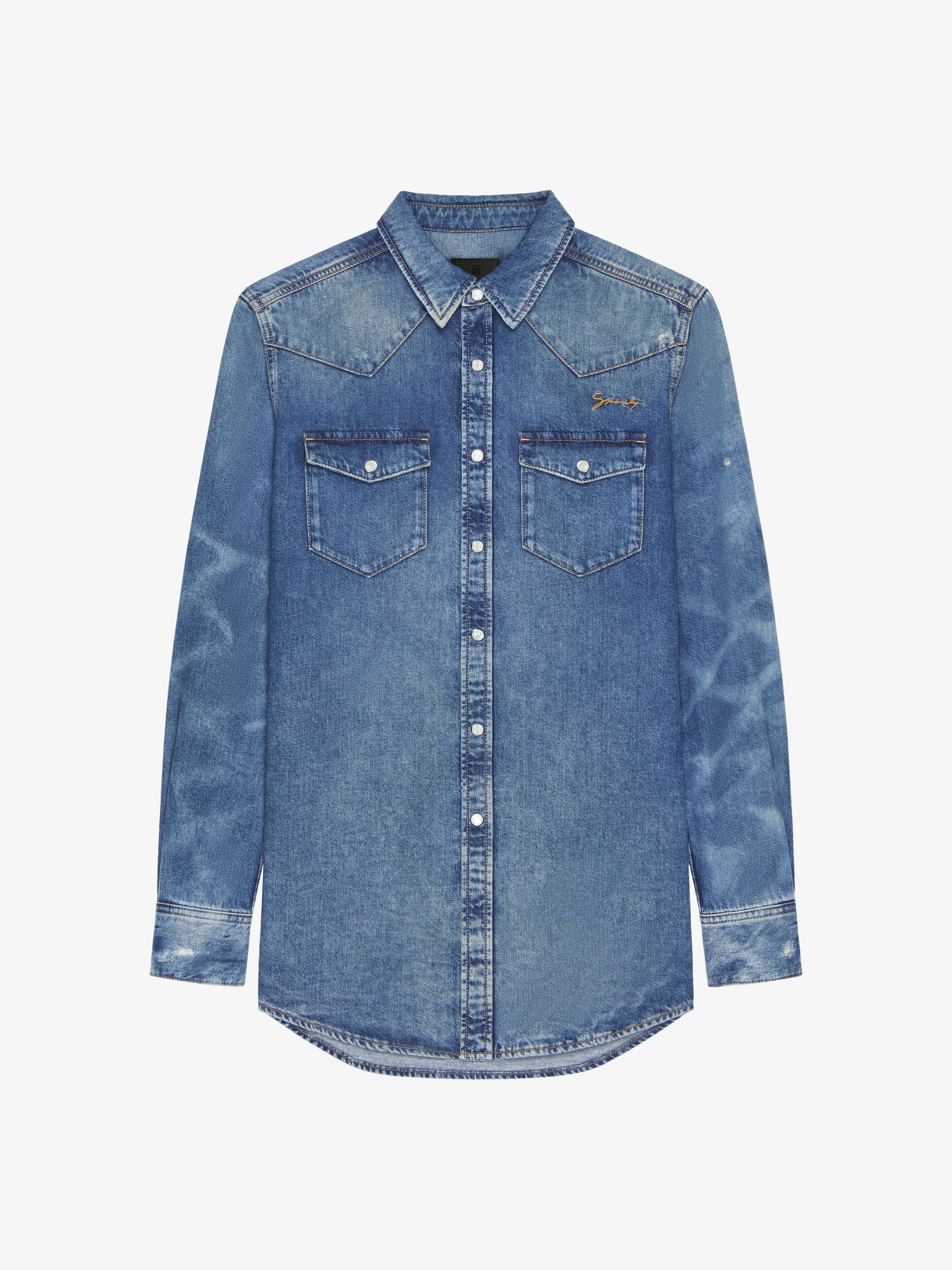 - Long-sleeved shirt in washed denim. - Classic collar. - Small GIVENCHY signature embroidered on the front. - Snap button closure. - Buttoned cuffs. - Two chest flap pocket. - Slim fit. - Model measures 6.1 Feet and wears a size M.
