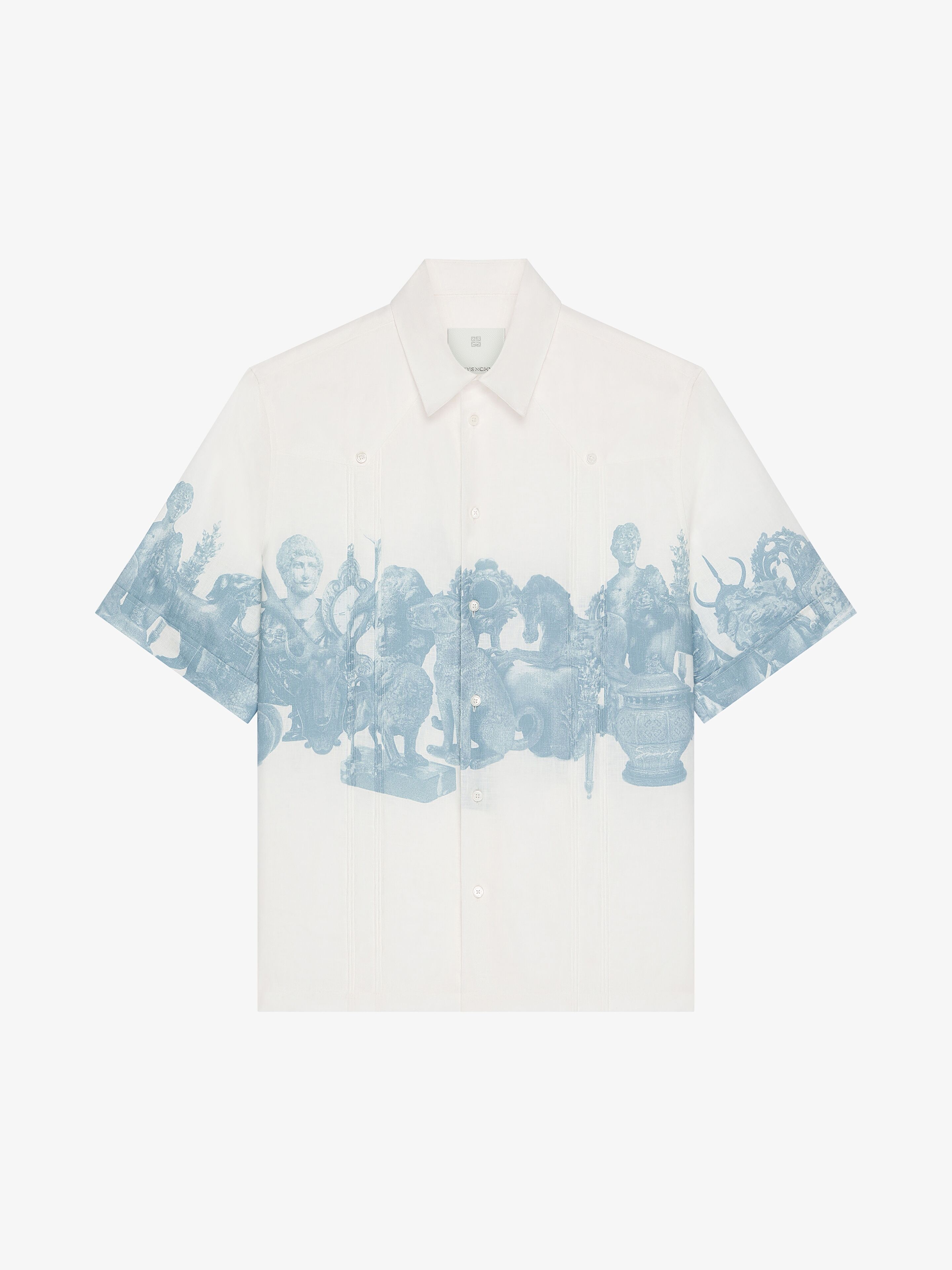 - Short-sleeved shirt in linen. - Classic collar. - Hubert objects print. - Small GIVENCHY signature in the pattern. - Button closure. - Small slits on the sides. - Classic fit. - Model measures 6.1 Feet and wears a size 39.