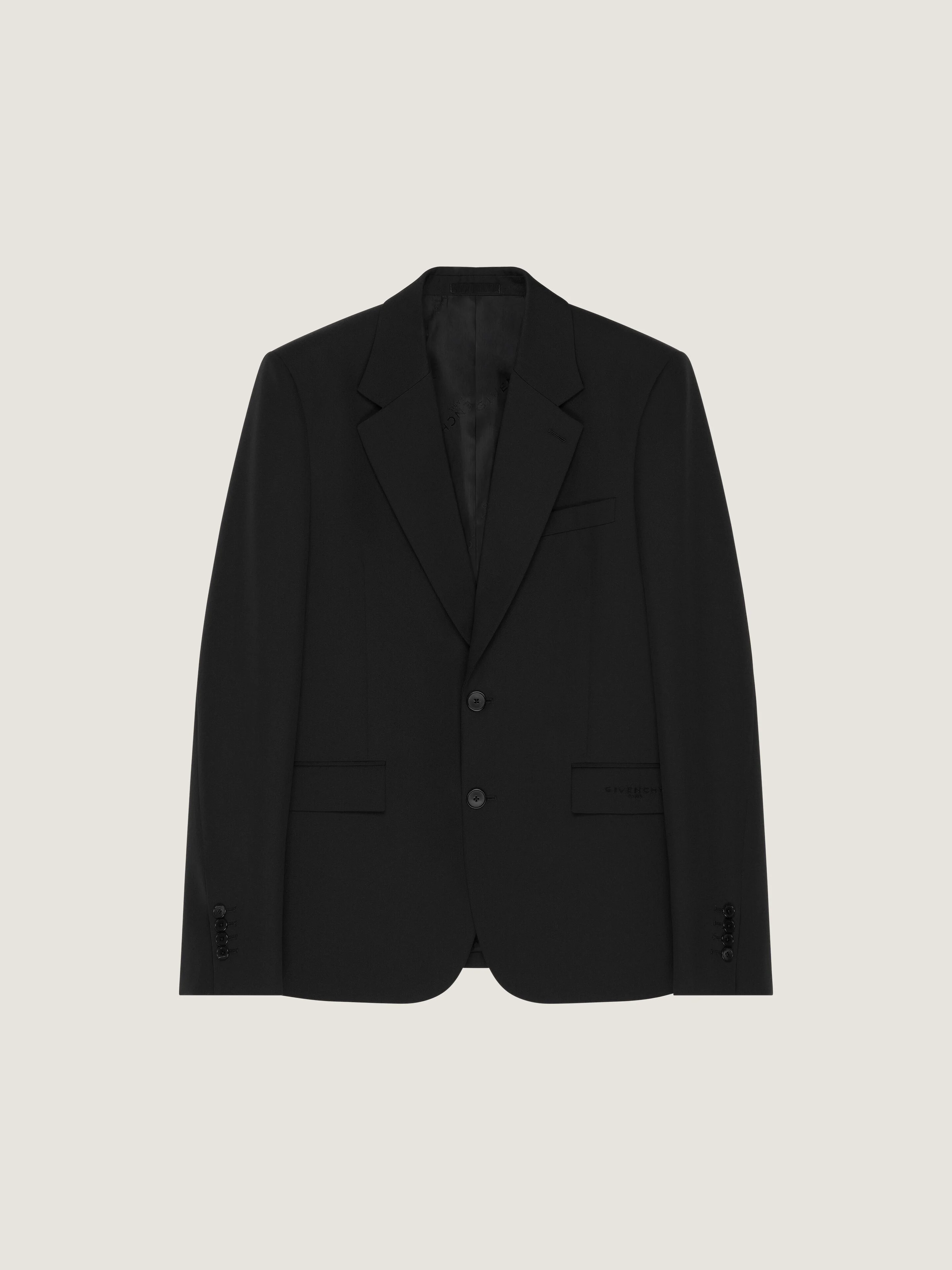 - Structured jacket in wool. - Notch lapel. - GIVENCHY Paris jacquard on the left flap pocket. - Single breasted. - Buttoned cuffs. - One chest pocket. - Two front flap pockets. - Regular fit. - Lining with all-over GIVENCHY Paris jacquard. - Model measures 6.1 Feet and wears a size 48.