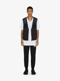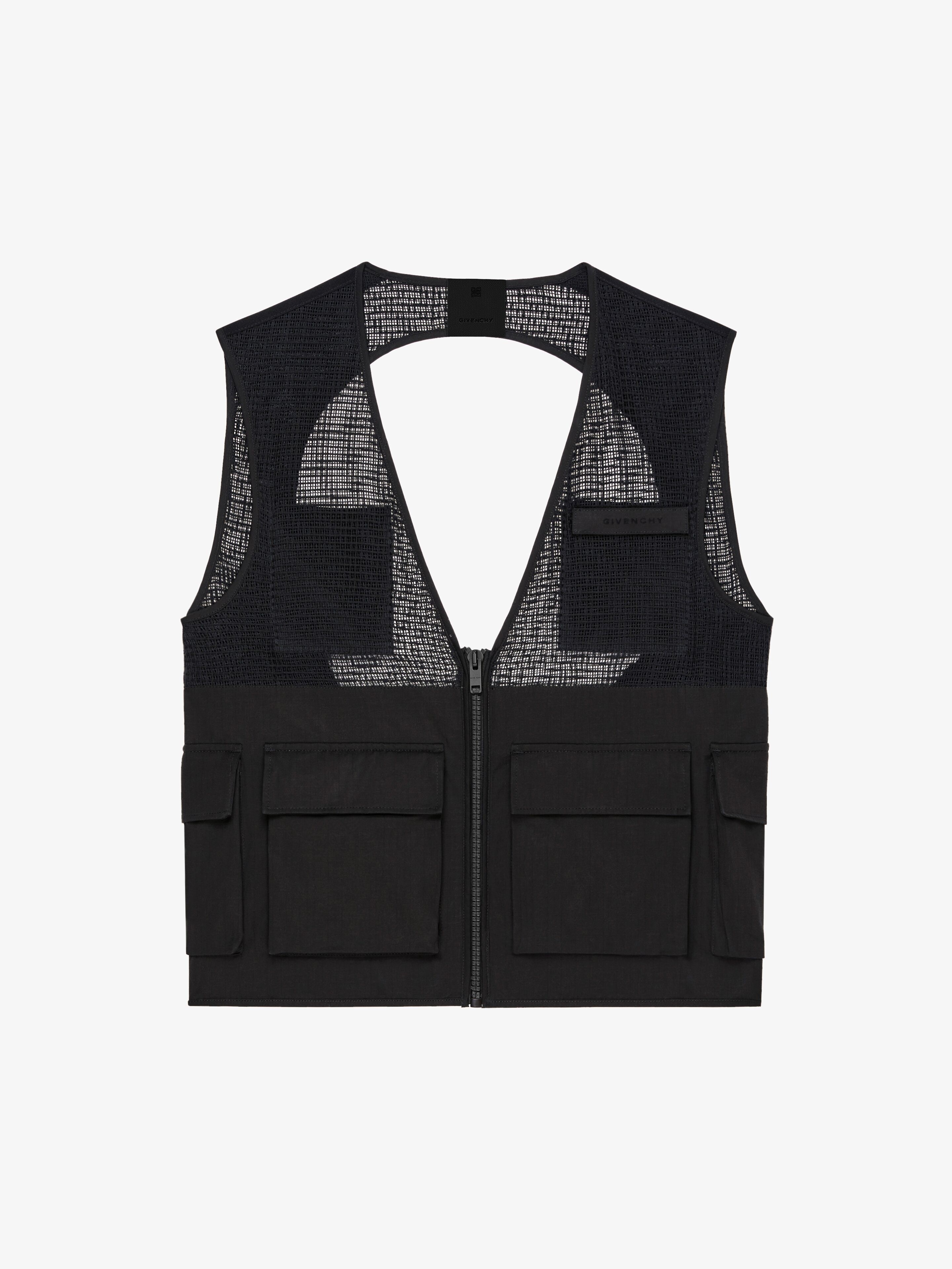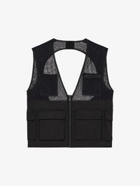 - V-neck cargo sleeveless jacket in cotton. - 4G closure with GIVENCHY engraved zipper. - Four flap pockets around the waist. - Embroidered GIVENCHY signature patch on the chest. - GIVENCHY signature debossed on a back scratch band. - Open back.