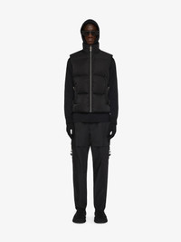 - Sleeveless puffer jacket in technical nylon. - High neck collar. - Metal zipper closure with GIVENCHY 4G zipper pull. - Open sides with canvas and leather cinch straps and 4G metal clip buckles. - Two zippered pockets on the sides. - Model wears a size 48.