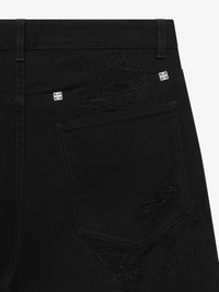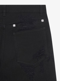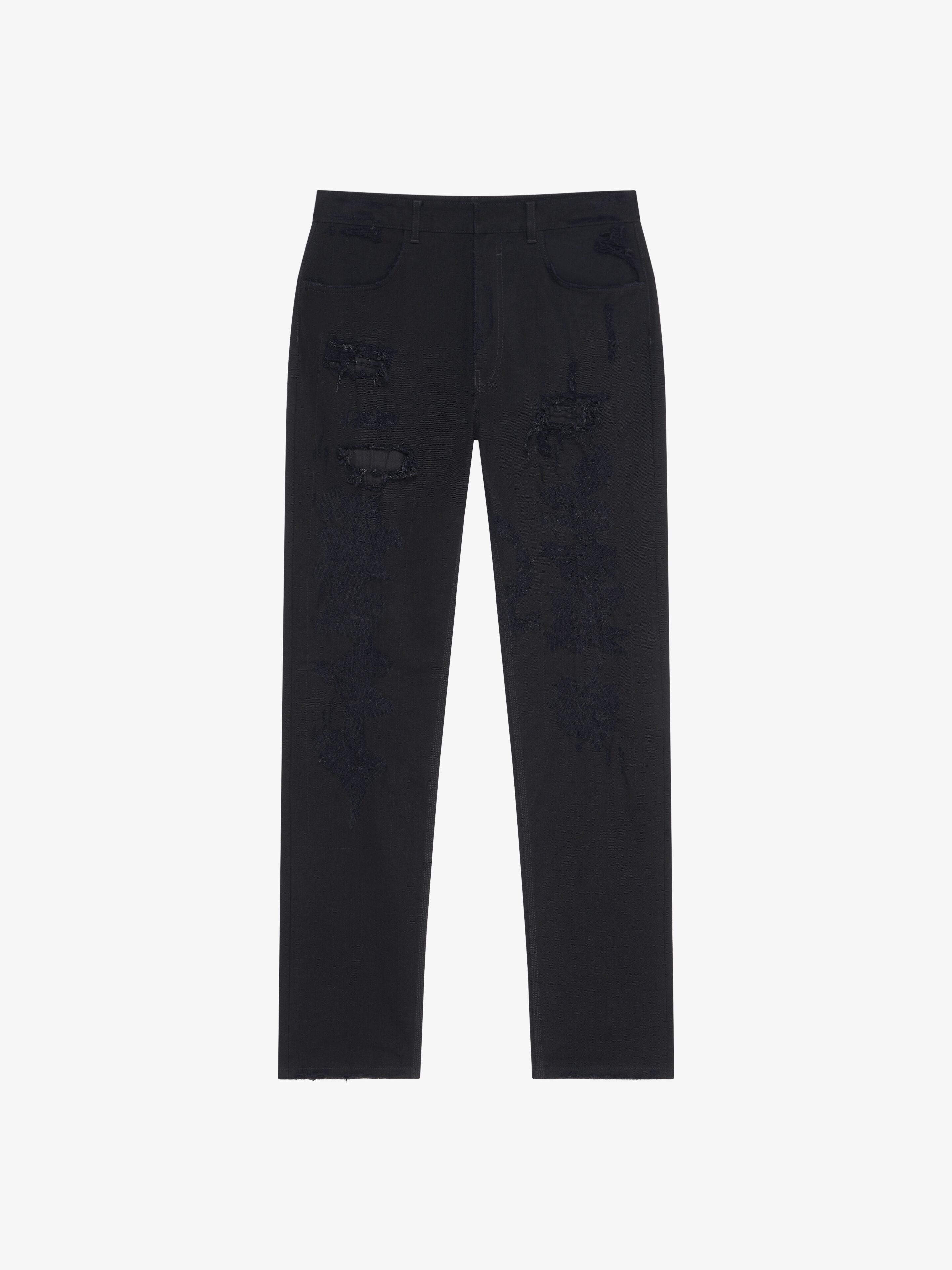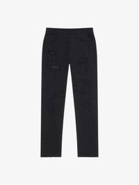 - Jeans in stretch denim. - Topstitched ripped-effect tears with tone-on-tone canvas trim. - Waist with loops and zipped closure. - Two front pockets. - Two pockets and one hidden pocket on the back. - 4G metal rivets in the back. - Slim fit.