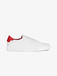 Urban Street sneakers in matte white leather with red leather inset, knots, and gold GIVENCHY PARIS signature on the back. Gold GIVENCHY PARIS signature on the tongue. Red leather insole. Product code: BH0002H0FS-112 Composition: 100% calfskin leather. Secondary materials: 100% calfskin leather. Size & Fit Fits large to size: Take one size smaller than normal Other Country of origin: Portugal.