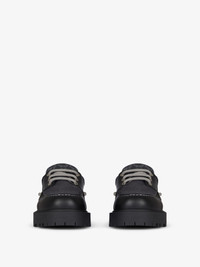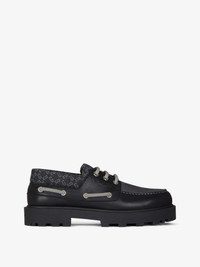 - Boat shoes in leather, suede and monogram 72 denim. - Storm line. - Padded backtop for comfort. - Matching laces details. - Contrasting stitching. - GIVENCHY signature debossed on the side and on the back of the sole. - GIVENCHY signature debossed on the leather insole. - Thick chunky rubber sole.