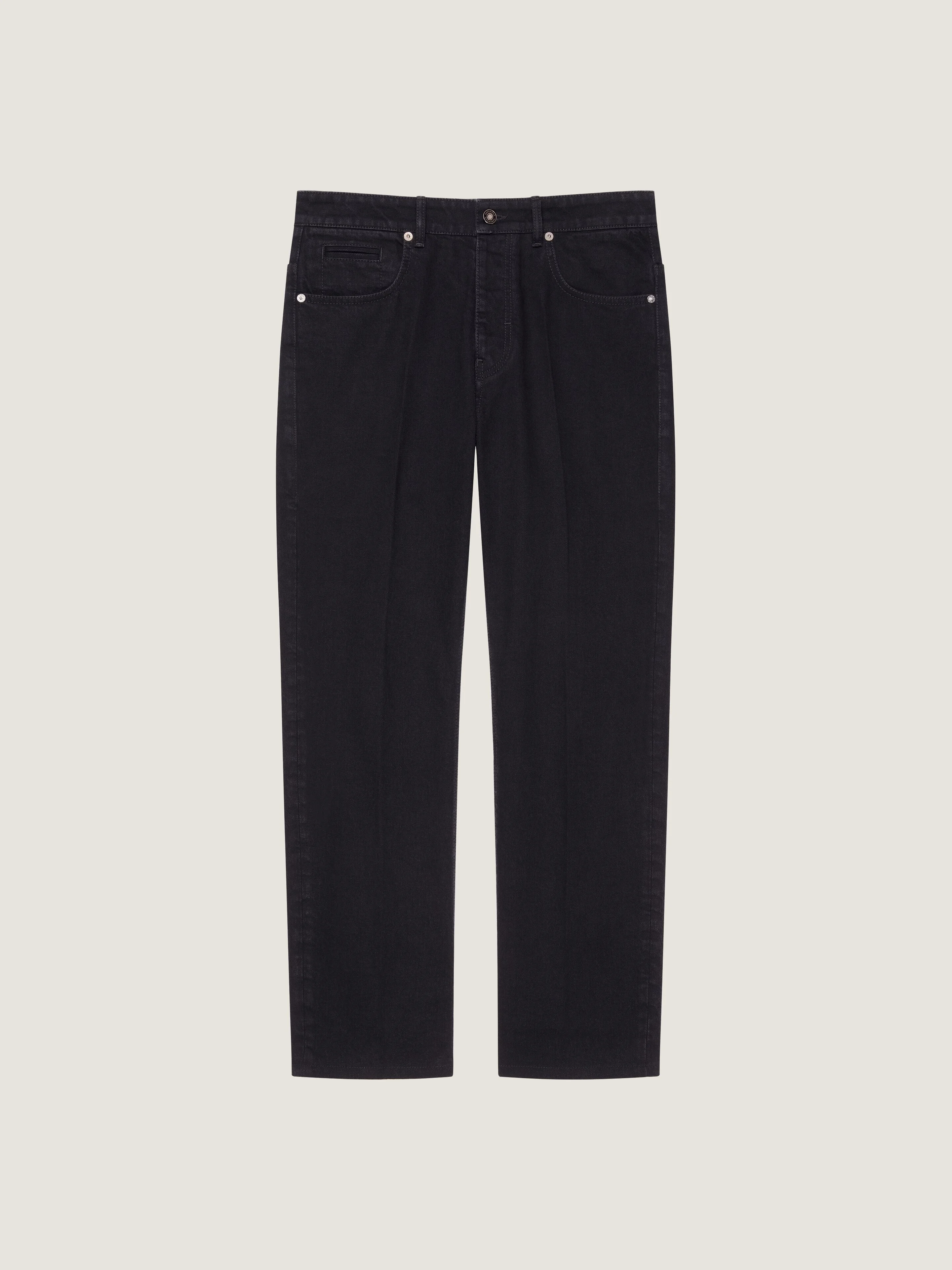 - Jeans in denim. - Waist with loops, zipped and button closure. - GIVENCHY engraved button. - GIVENCHY suede leather patch on the back. - GIVENCHY Paris signature embroidered on the right back pocket. - Three front pockets. - Two back pockets. - Straight fit. - Model measures 6.1 Feet and wears a size 30.