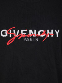 Crew-neck sweater in black wool jersey with white knitted GIVENCHY signature and red embroidered handwritten GIVENCHY signature. Collar, hem, and cuffs in ribbed knit. Product code: BM90B1404X-009 Composition: 100% wool. Other Country of origin: Italy. Dry clean recommended Iron at maximum soleplate temperature (110°C) without steam Do not tumble dry Do not bleach