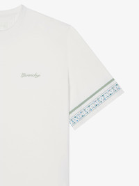 - Short-sleeved t-shirt in cotton. - Crew neck. - Small GIVENCHY signature embroidered on the chest. - Polka flower print on the bottom sleeves. - Small 4G emblem embroidered on the lower back. - Classic fit. - Model measures 6.1 Feet and wears a size M.