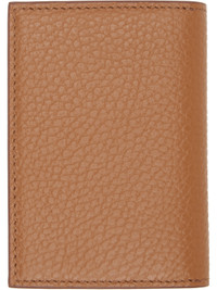 Grained calfskin bifold card holder. · Logo stamp at face · Press-stud closure · Three card slots · Two patch pockets · Buffed calfskin interior · Canvas lining · H2.75" x W4" x D0.75" Supplier color: Hazel Body: 100% calfskin. Lining: 100% viscose. Made in Italy 261278M163009