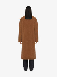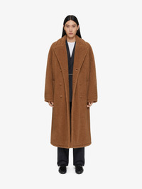 - Long teddy coat in camel hair and silk. - Notch lapel. - Button closure. - Two side pockets. - Open armholes. - Slits on the sides. - Satin lining with Monogram 72. - Model measures 6.1 Feet and wears a size 48.