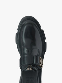 - Derby shoes in brushed calfskin leather. - Terra line. - Leather strap with silvery-finish 4G metal clip buckle on the foot. - Metal 4G emblem on the tongue. - Raised GIVENCHY signature on the heel. - Thick sole with ranger-style studs.