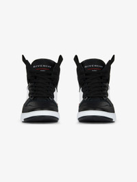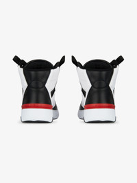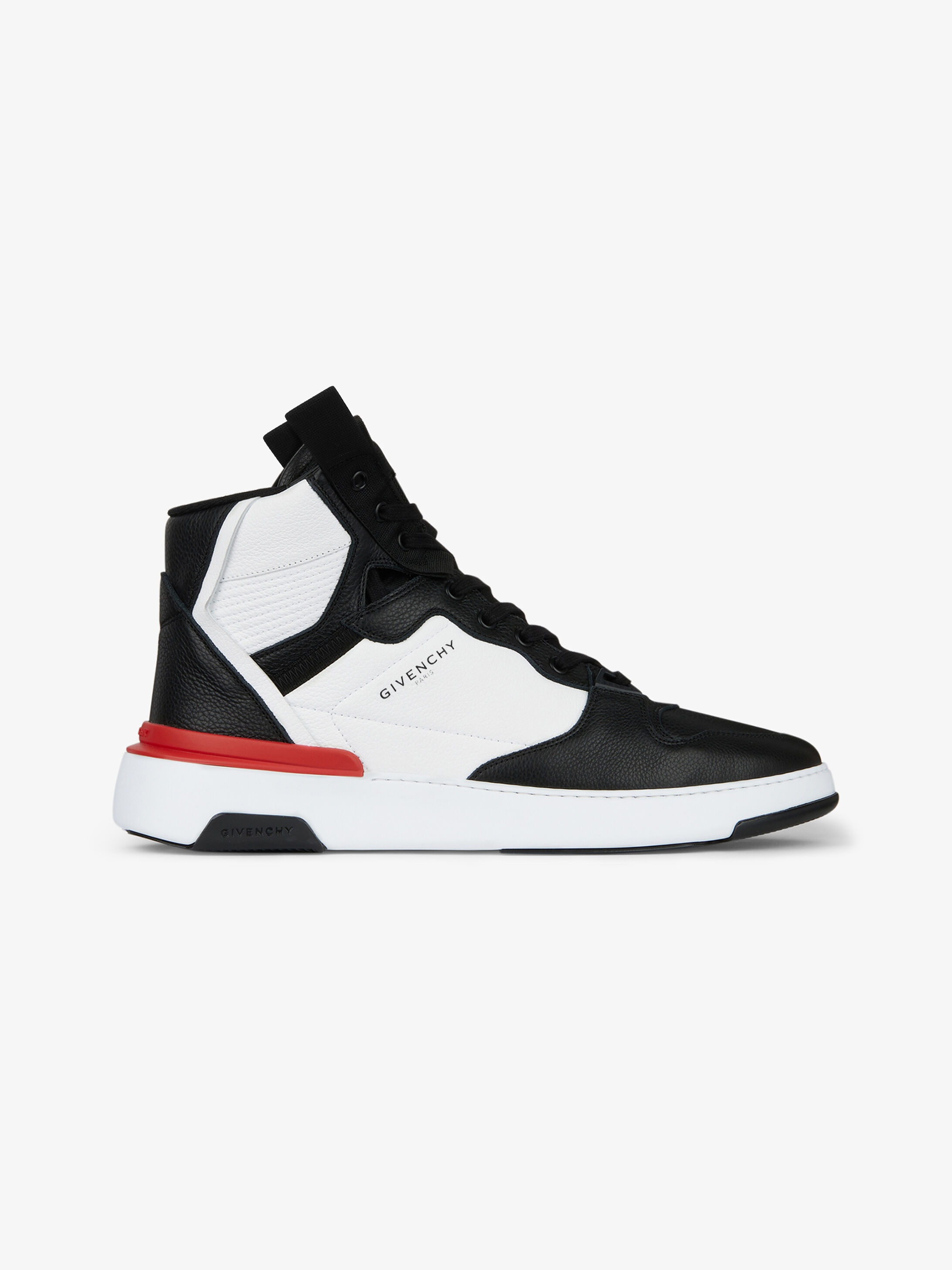 Wing high-top sneakers in black and white grained leather with inset embellishments, graphic topstitching and perforations, black canvas bands on the lacing, and black canvas tongue with white and red GIVENCHY PARIS signature. Sole in black and white lightweight EVA with red thermoplastic reinforcement and raised GIVENCHY signature on the back. Product code: BH002JH0K6-004 Composition: 100% calfskin leather. Secondary composition: 100% calfskin leather. Lining: 100% polyester. Size & Fit Fits true to size. Take your normal size Other Country of origin: Italy.