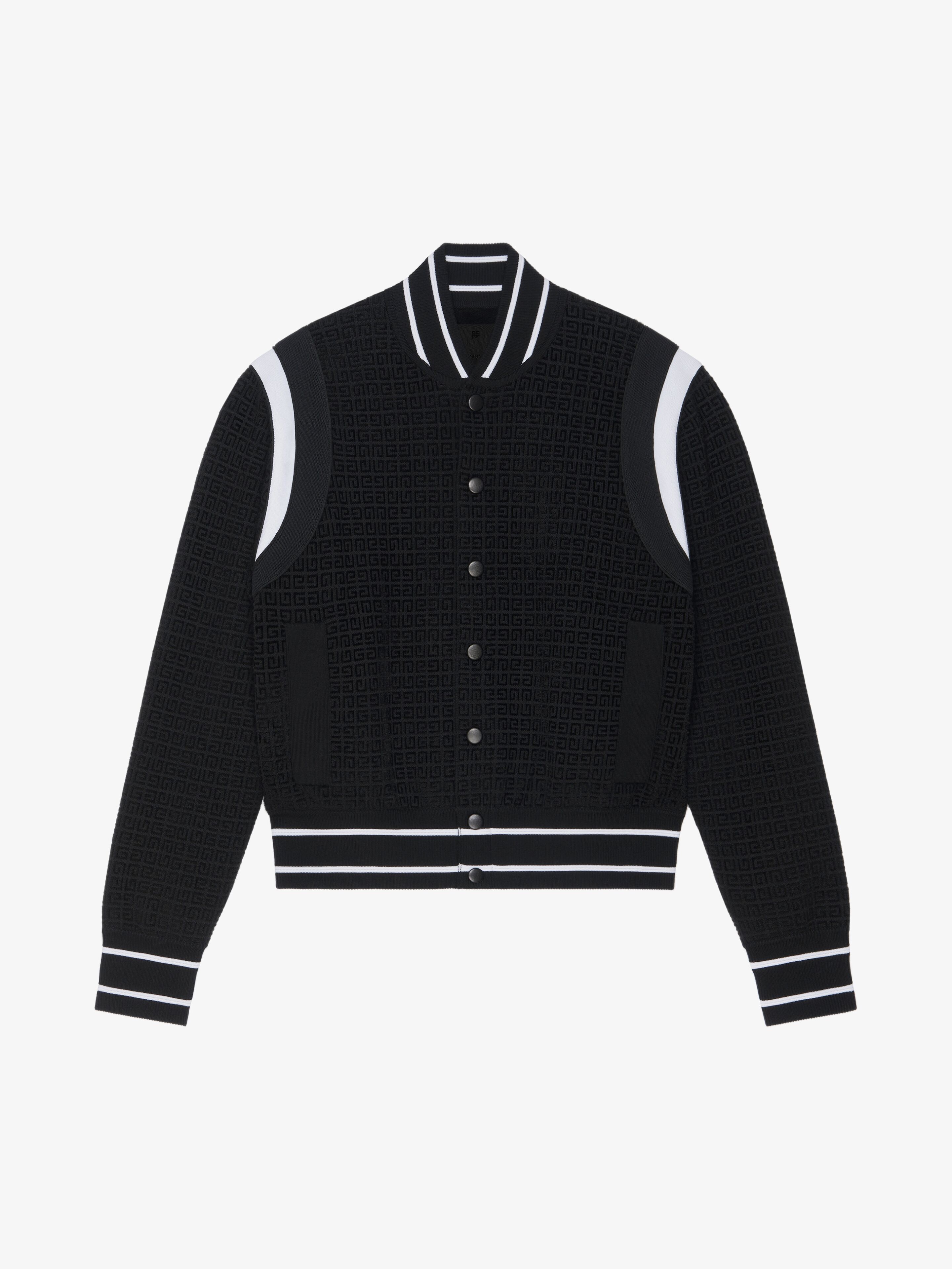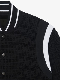 - Varsity jacket in cotton knit with velvet effect tone-on-tone 4G all over pattern. - Ribbed elasticated knit collar, cuffs and hem with contrasting stripes. - Contrasting details on armholes. - Snap closure. - Classic fit.