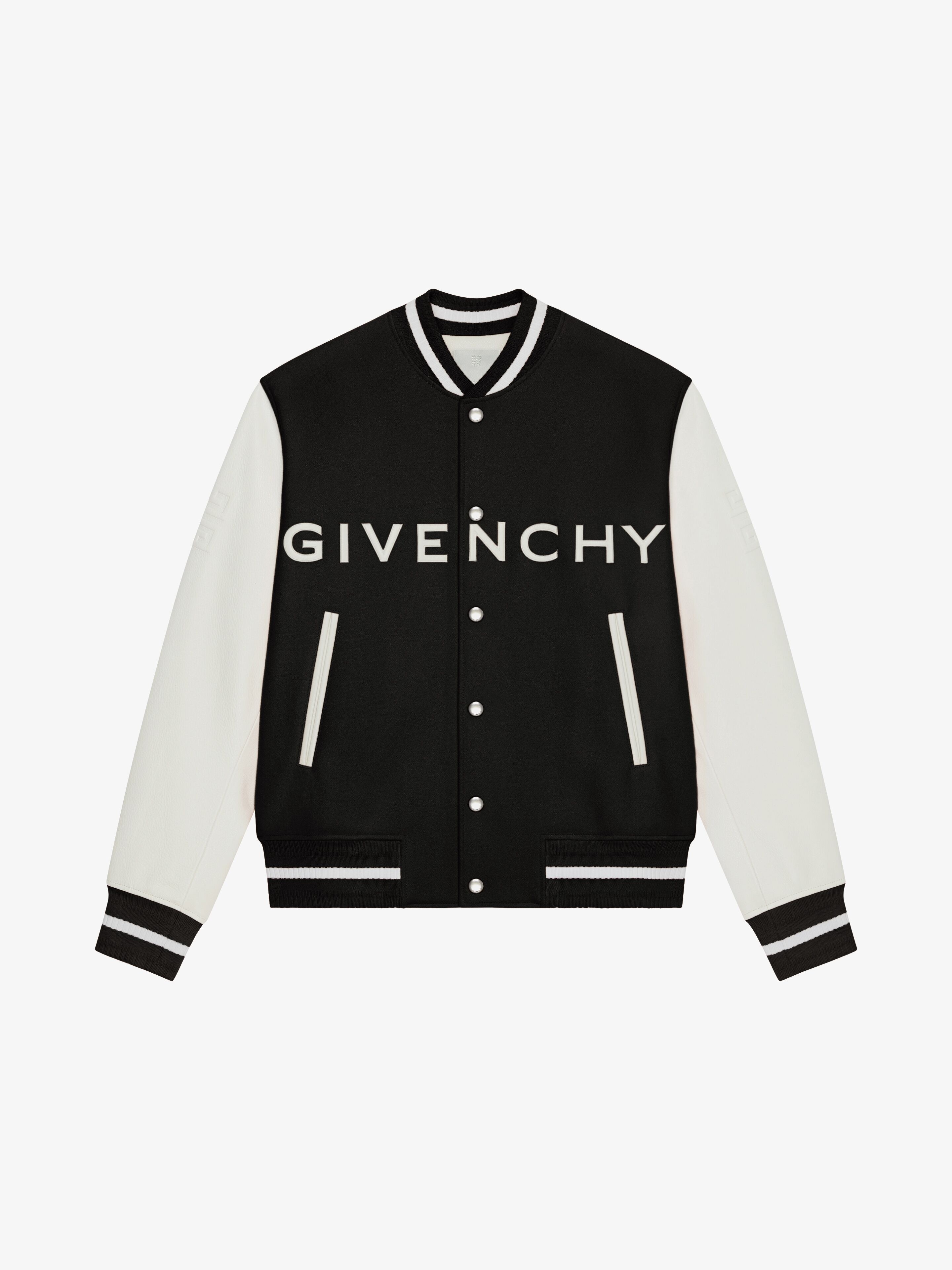 - Virgin wool blend and grained leather varsity bomber jacket. - Grained calfskin leather sleeves. - Embroidered GIVENCHY signature patches on the front. - Embossed 4G crests on sleeves. - GIVENCHY metal snap closure. - Contrasting ribbing at collar, hem and cuffs. - Two piped pockets on the sides. - Model measures 6.1 Feet and wears a size 48.