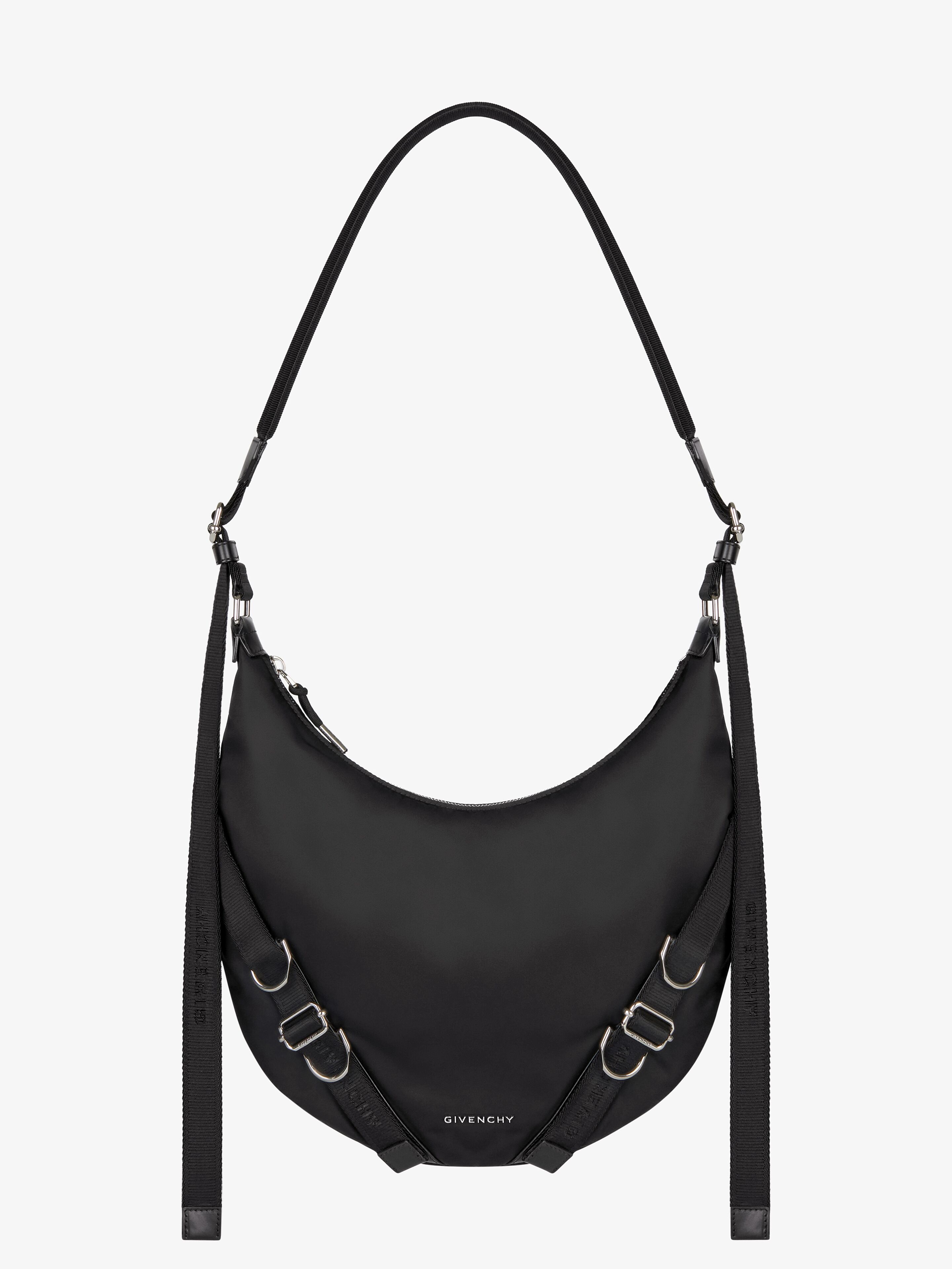 - Crossbody bag in nylon. - Voyou line. - Adjustable GIVENCHY webbing shoulder strap offering comfortable shoulder or crossbody carrying. - GIVENCHY-engraved metal buckles. - Silvery-finish metal details. - Metal GIVENCHY signature on the front of the bag. - One main compartment and one inside flat pocket.
