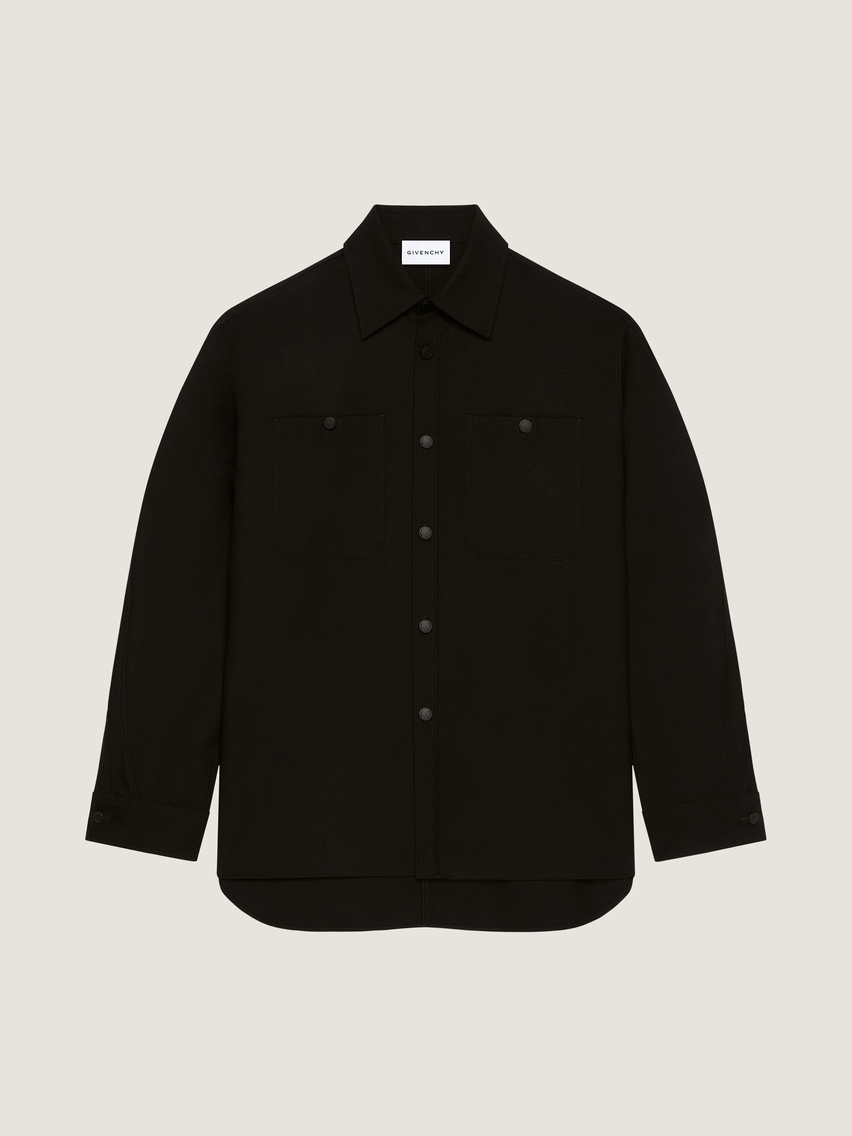 - Overshirt in flannel wool. - Classic collar. - Small GIVENCHY signature embroidered on the button tab. - Button closure. - Buttoned cuffs. - Two chest pockets. - Bias seams for a cocooning volume. - Relaxed fit. - Model measures 6.1 Feet and wears a size M.