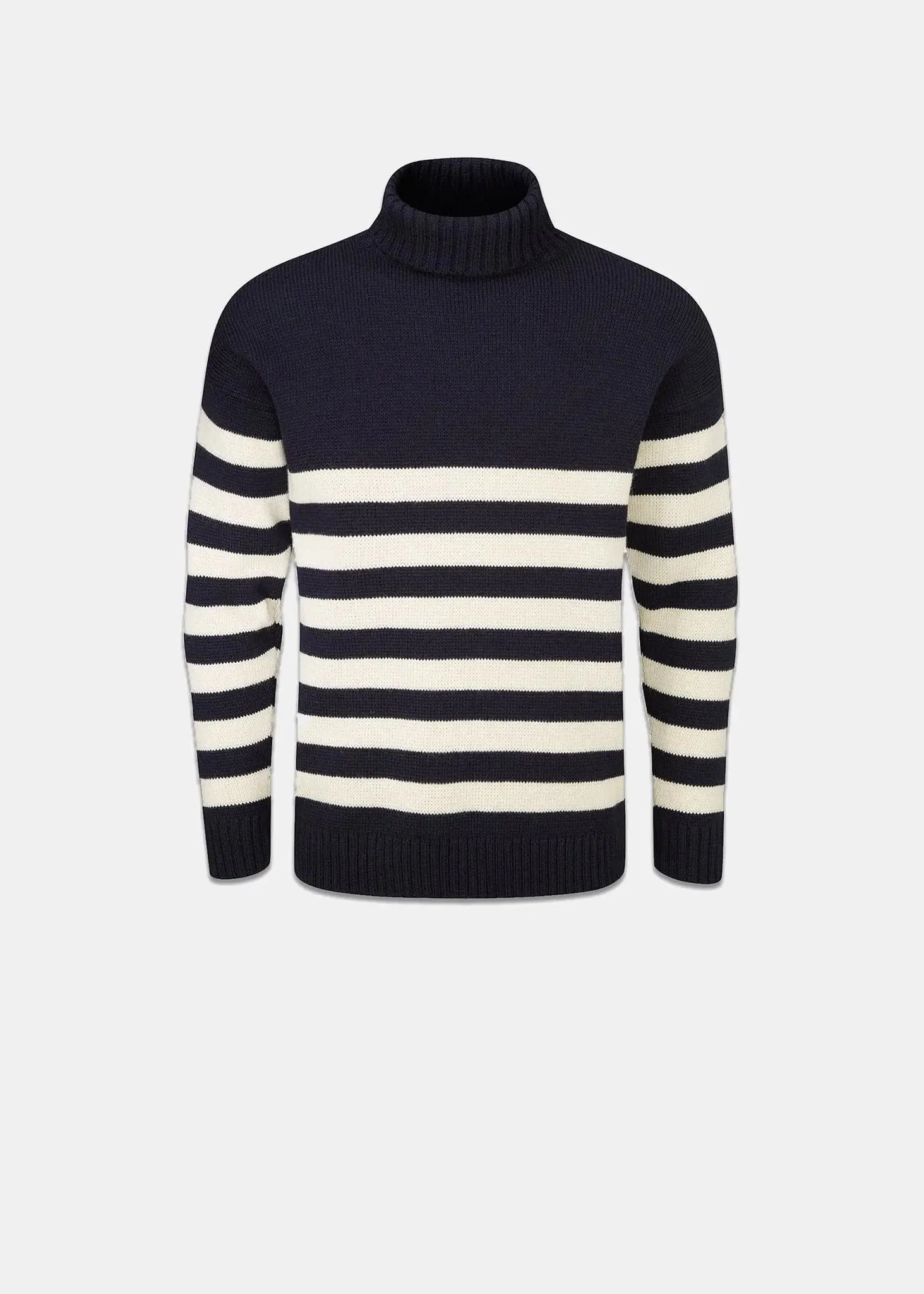 Background Regular fit submariner roll neck sweater, with single ribbed neck, cuff and hem. Fashioned from 100% 5 gauge merino wool, this jumper is ideal for the colder months. Inspired by the traditional submariner style, wear this stylish garment to keep warm this season, as part of a smart-casual ensemble. Model is 6’3”, chest size 39" and wears a size M. Design Details - Made in England - Ribbed cuffs - Regular fit - Ecru Stripe - Product Code: MK5088 Fabric & Care - Main: 100% Merino wool - Hand wash only - Wash inside out - Do not bleach - Pull into shape when damp - Dry flat