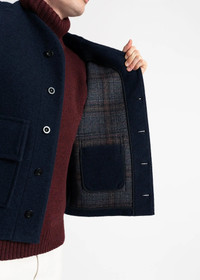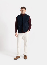 Background Keep it light in our versatile Roger Gilet. Offering a layer of warmth without the heaviness of an overcoat, this gilet is crafted from a double-faced wool mix fabric with a plain outer and subtle check interior. A functional piece of workwear-inspired style, it features a V at the neck, two large patch pockets and a three-buttoned front. Perfectly layered over knitwear or under a winter coat, you can depend on this piece to see you through the seasons. Model is 6’1”, chest size 38” and wears a size M. Design Details - Double faced woven, plain on face, brown check on reverse - Button closure - Large patch pockets - Style Code: MS5380 Fabric & Care - 48% Polyester, 36% Cotton, 16% Wool - Dry clean only - Do not machine wash - Do not tumble dry - Do not bleach - Cool iron