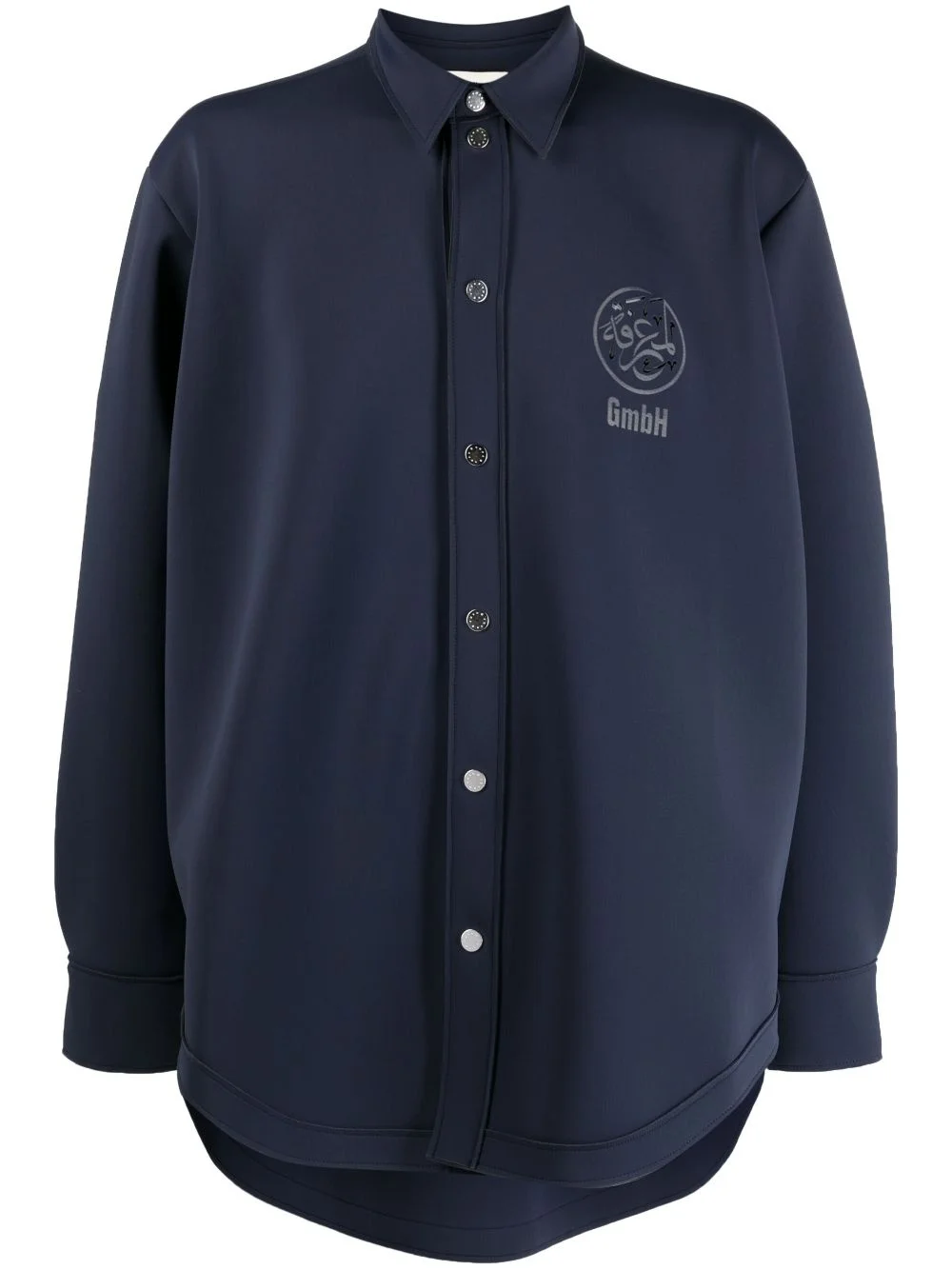 logo-print recycled nylon shirt Highlights - Indigo blue - Recycled nylon blend - Logo print at the chest - Classic collar - Front button fastening - Long sleeves - Buttoned-cuff sleeves - Curved hem Imported Composition Body: Recycled Nylon 83%, Elastane 17% SIZE & FIT Model measurements Height 6 ft 2 in(1.87 m) Bust/Chest 36.22 in(92 cm) Hips 37.79 in(96 cm) Waist 28.34 in(72 cm) Washing instructions Machine Wash