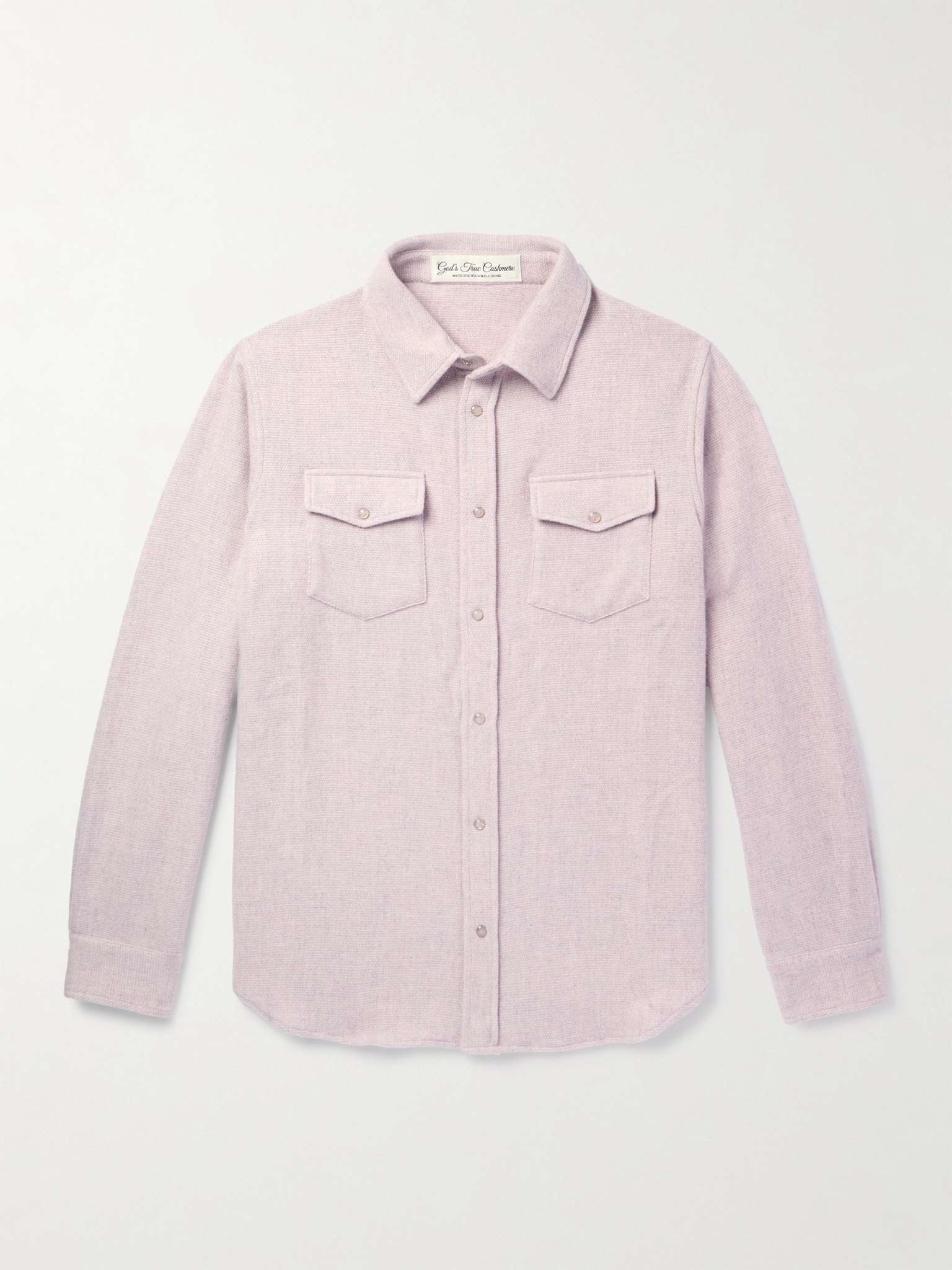 God's True Cashmere's designs are meant to last a lifetime and be passed down through generations. This shirt has been crafted in Italy from the soft, signature fabric and fastens with eleven hand-carved rose quartz snaps, symbolising compassion and love. Size & Fit - Fits true to size. Take your normal size - Designed for a relaxed fit - Lightweight, non-stretchy fabric - Model is shown wearing a M - Model measures: chest 38"/ 96cm, height 6'3"/ 191cm Details & Care - Light-pink mélange cashmere - Snap fastenings - 100% cashmere - Hand wash