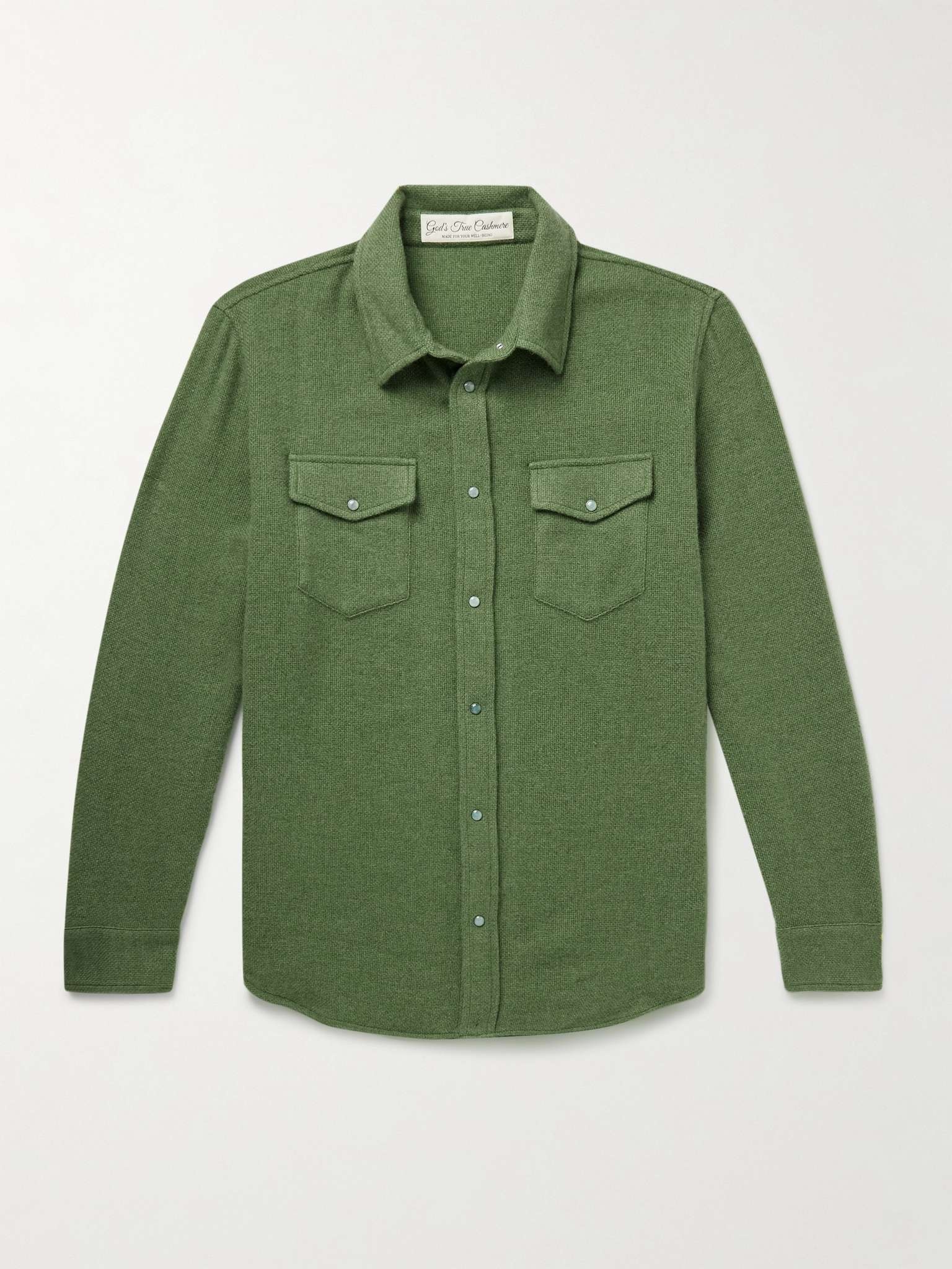 God's True Cashmere's designs are meant to last a lifetime and be passed down through generations. This shirt has been crafted in Italy from the soft, signature fabric and fastens with eleven hand-carved emerald snaps, symbolising compassion and love. Size & Fit - Fits true to size. Take your normal size - Designed for a relaxed fit - Lightweight, non-stretchy fabric - Model is shown wearing a M - Model measures: chest 38"/ 96cm, height 6'1"/ 185cm Details & Care - Green cashmere - Snap fastenings - 100% cashmere - Hand wash - Designer colour: Willow Green