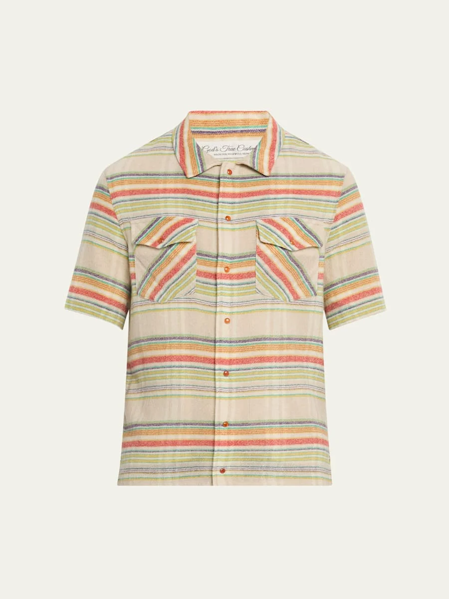 God's True Cashmere sport shirt in multicolor striped gauze fabric Eleven hand-carved, gemstone snaps Spread collar Snap front closure Two chest flap pockets Short sleeves Cashmere Hand wash cold Made in Italy Online Inquiries: BGS21_NCZ9U| Store Inquiries: #4980458