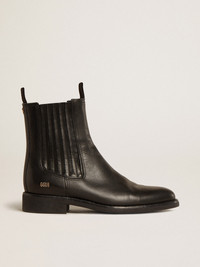 A timeless silhouette: the Chelsea boot, featuring clean simple lines, is the perfect blend of style and comfort. This men’s model features a black leather upper and gold-colored GGDB lettering on the side. The black stretch insert on the side and the galvanic antique gold star on the heel tab complete the look. DETAILS Item No. GMF00540.F004898.90100 - Color: black - Gold-colored GGDB lettering on the side - Stretch insert on the side - Antique gold-colored metal star on the heel tab - Heel height: 2.5 cm - Leg height: 16.5 cm - Upper: 100% cow leather - Lining: 100% cow leather - Sole: 100% rubber - Handmade - Made in Italy