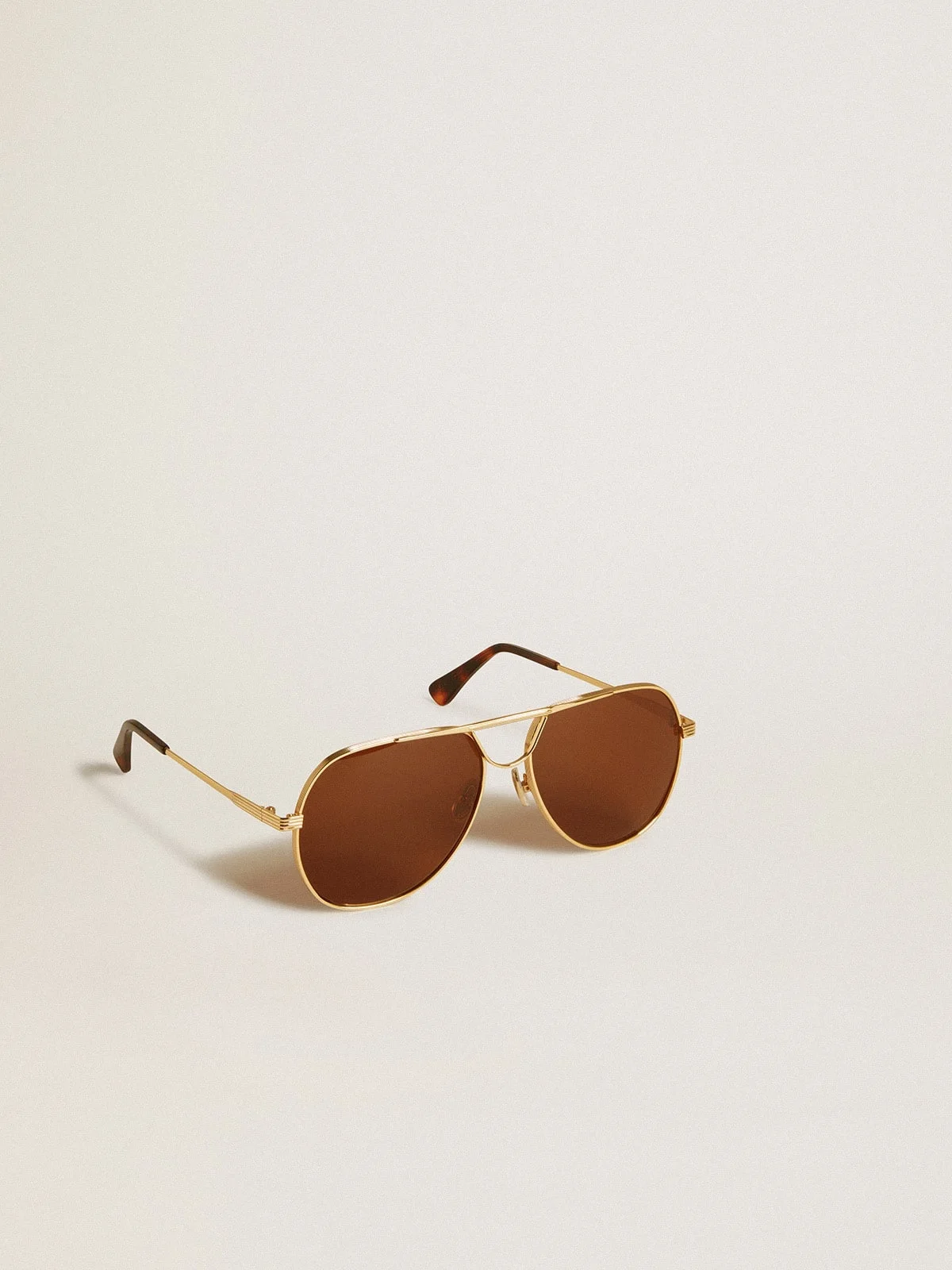 This aviator-shaped Sunframe Carter features a gold frame, brown lenses and tortoiseshell temple tips. DETAILS Item No. 8050235826939 - Aviator style - Color: gold - Brown lenses - Gold details - Tortoiseshell temple tips - Frame: 100% metal - Lenses: 100% polymer